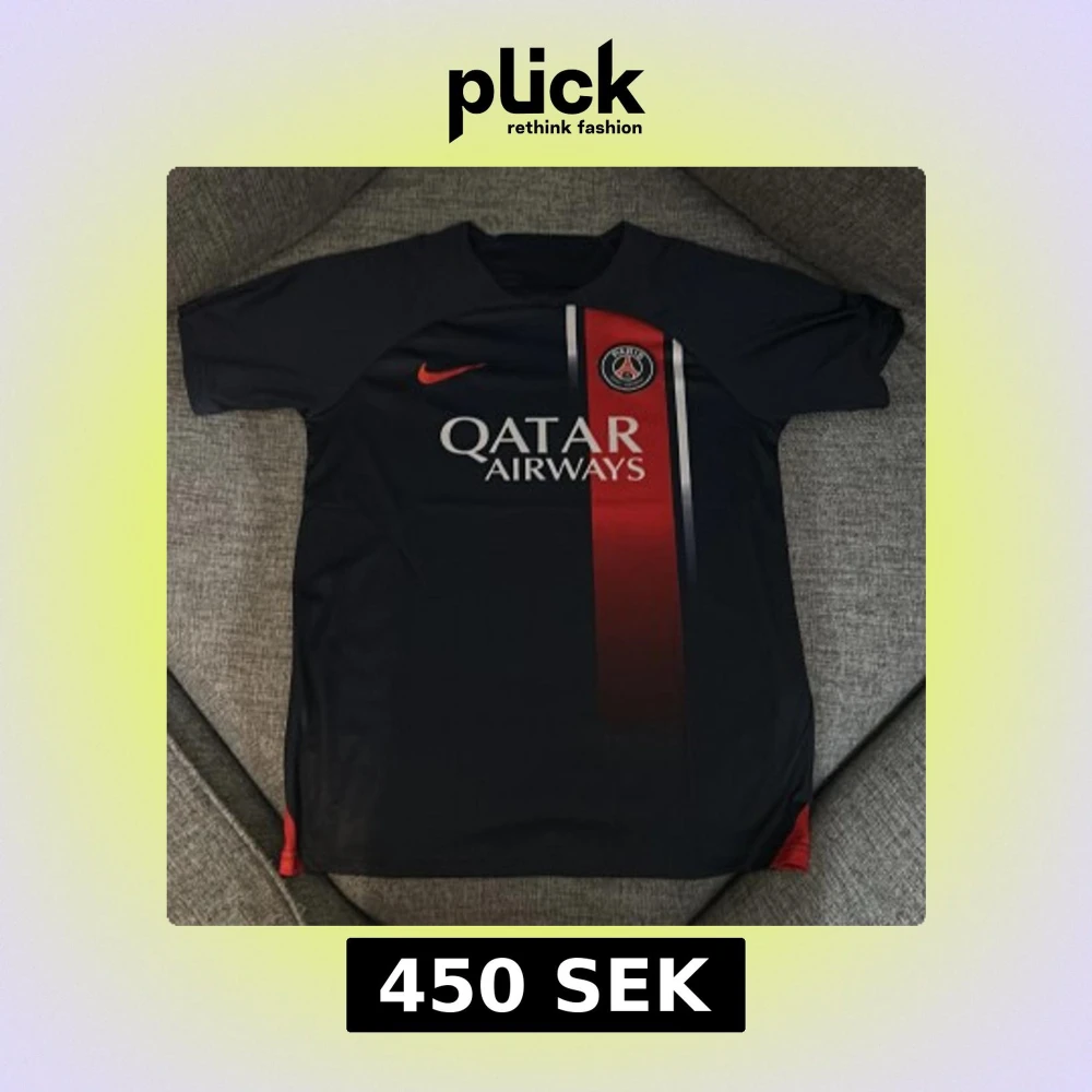 Snygg svart PSG fotbollströja från Nike med röd och vit detalj på framsidan. Tröjan har korta ärmar och klubbens emblem på bröstet. Perfekt för fans av Paris Saint-Germain!