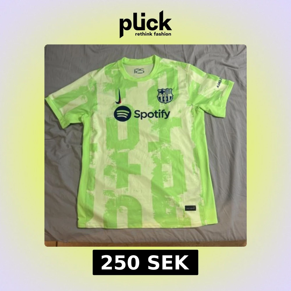 Säljer en FC Barcelona tredjetröja från säsongen 2024/25 i ljusgrönt med neongröna detaljer. Tröjan har klubbmärke , Spotify-logga och UNHCR-tryck. Kortärmad modell i lätt och ventilerande material, perfekt för match eller träning.