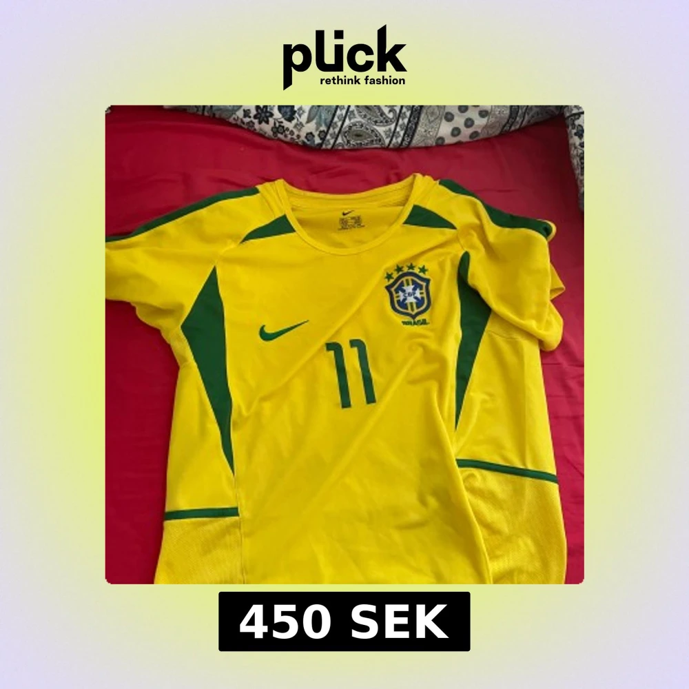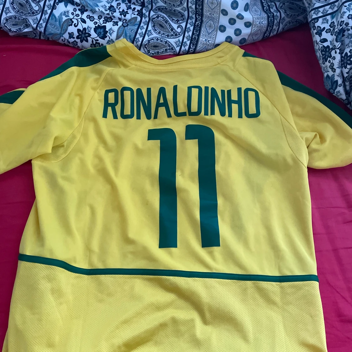 Säljer en gul Brasilien fotbollströja från Nike med gröna detaljer och nummer 11 på framsidan. Tröjan har korta ärmar och texten 'Ronaldinho' på baksidan. Perfekt för fotbollsfans som älskar klassiska landslagströjor!