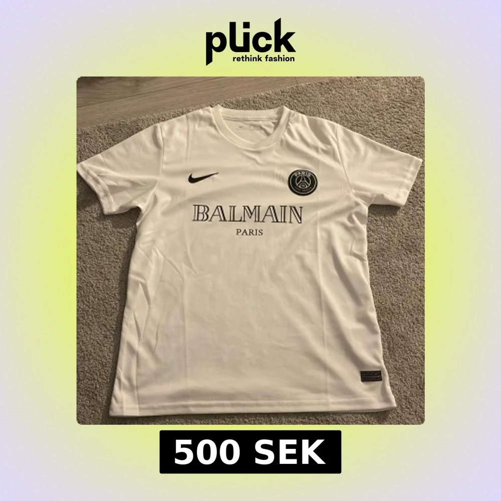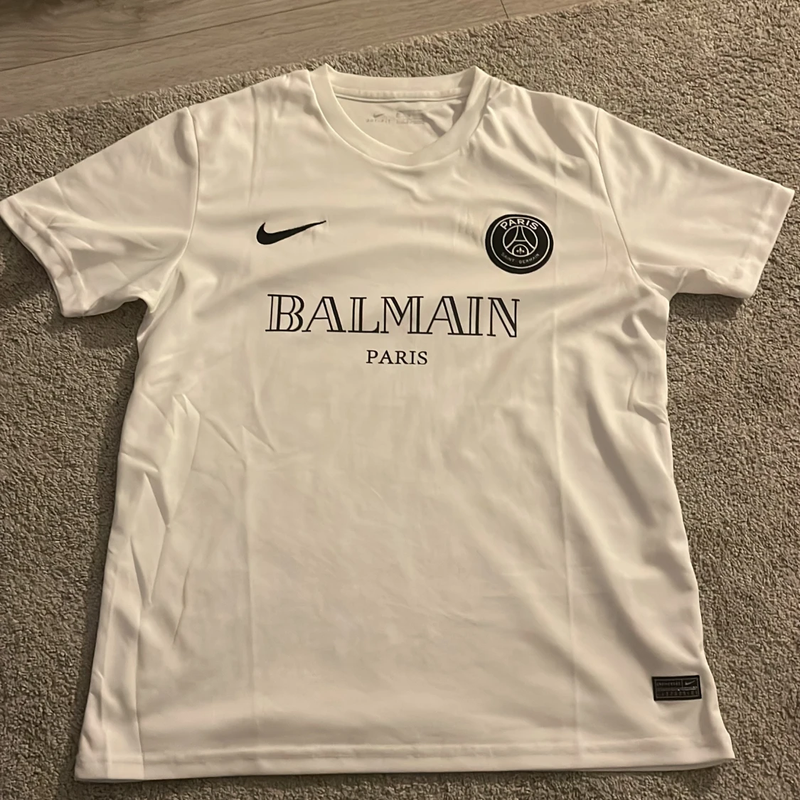Snygg vit fotbollströja från Nike i samarbete med PSG och Balmain. Tröjan har korta ärmar, rund hals och tryck med Paris Saint-Germain-logga samt Balmain Paris på bröstet. Tillverkad i lätt och sportigt material, perfekt för fotbollsplanen eller streetstyle.