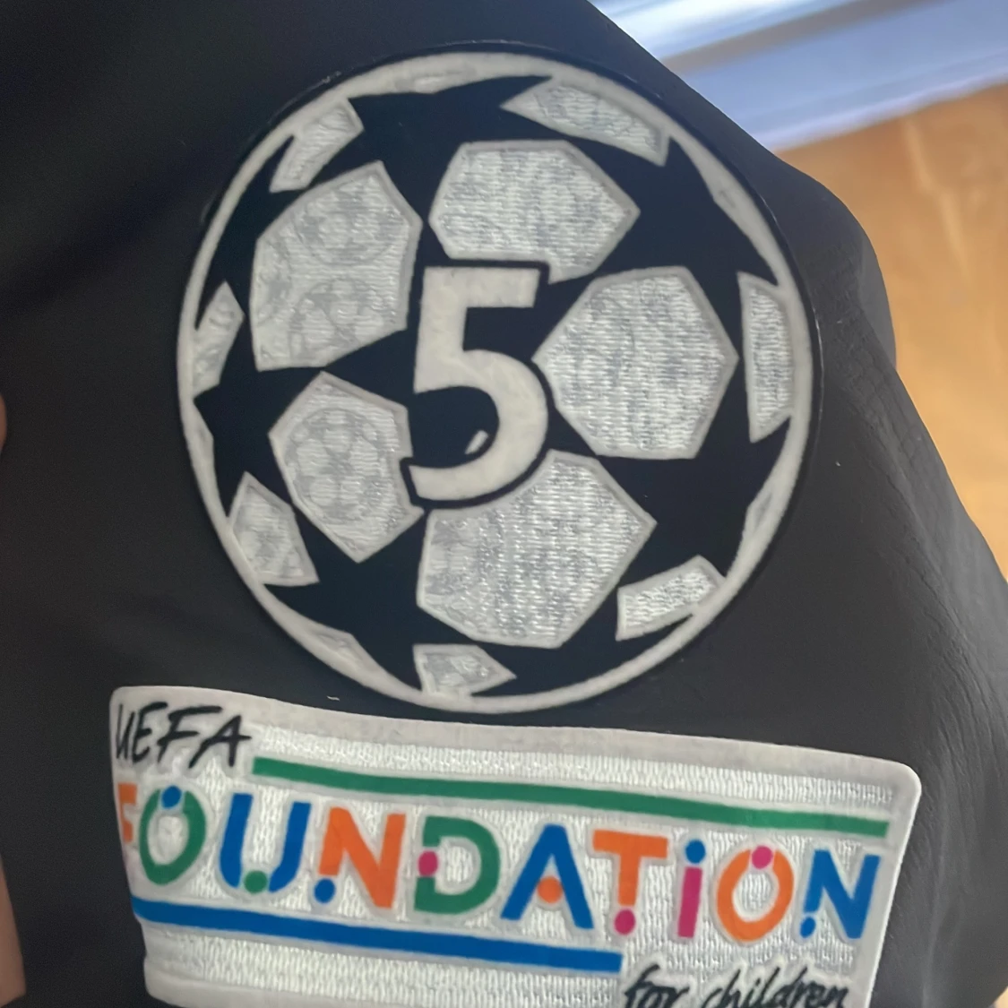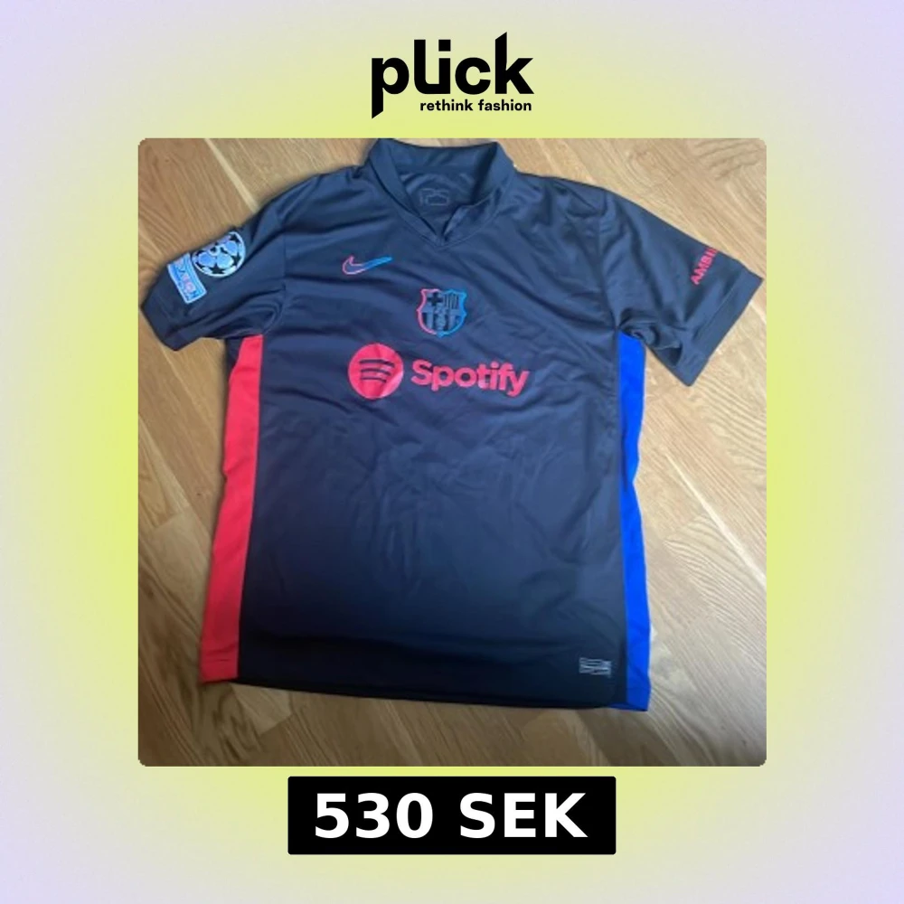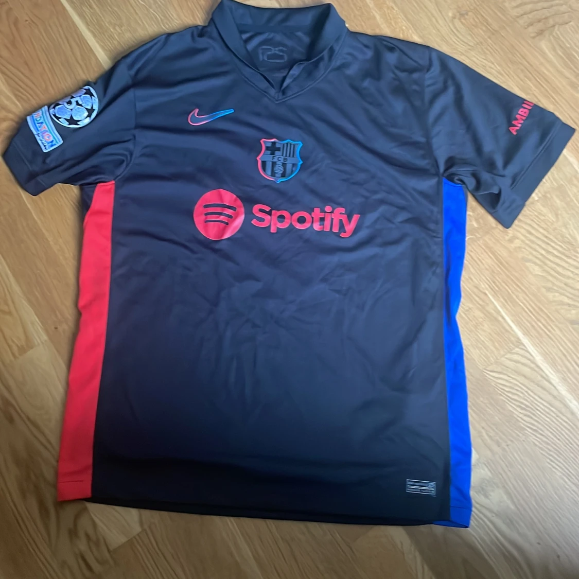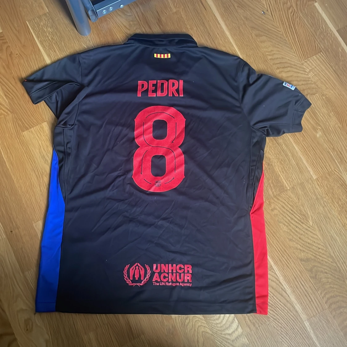 Säljer en svart FC Barcelona matchtröja med Pedri #8 på ryggen. Tröjan har röda och blå sidopaneler, Champions League-märke på ärmen, Spotify-logga på bröstet och UNHCR-tryck bak. Tillverkad i lätt och ventilerande material, perfekt för fotbollsälskare. 2024-2025 borta set
