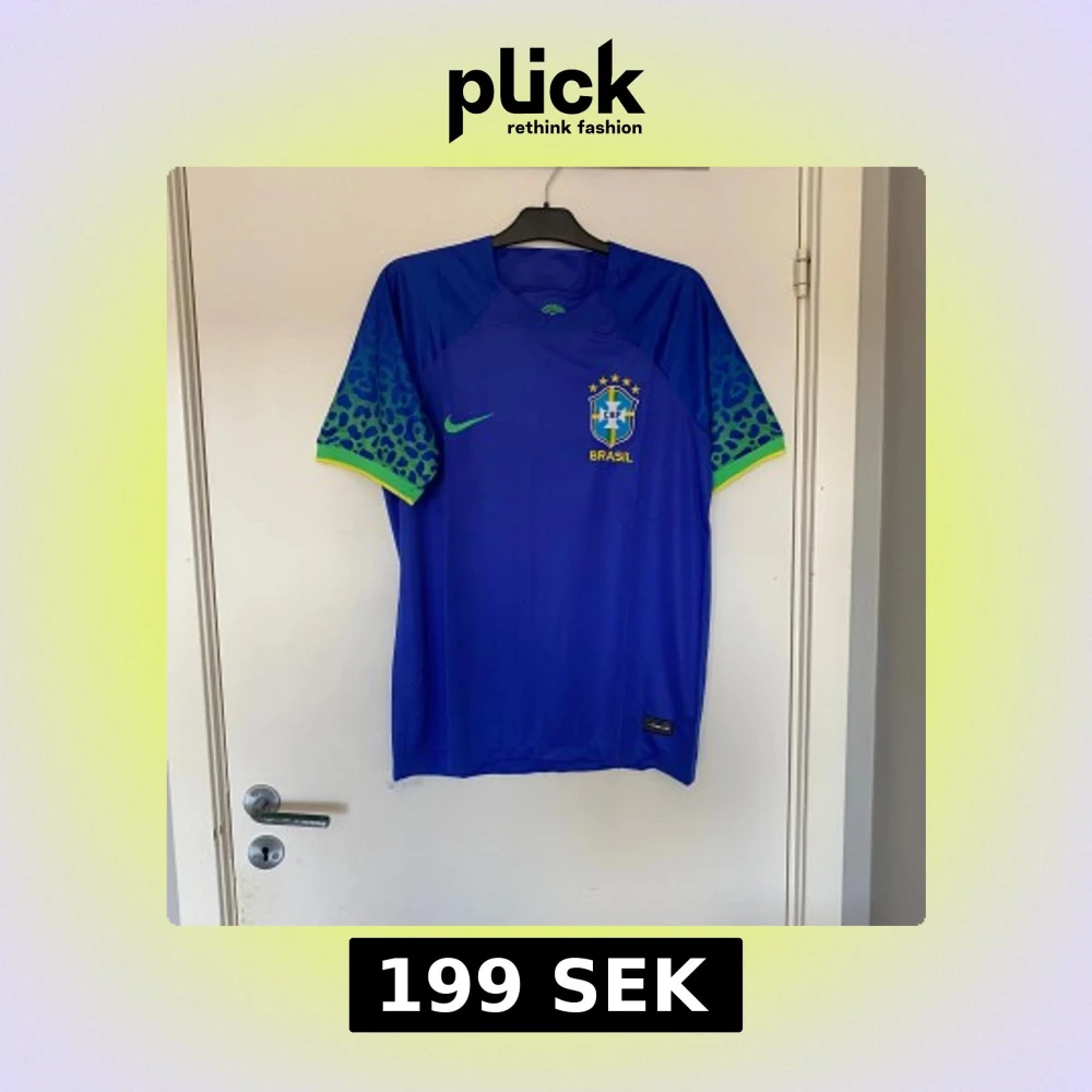Säljer en blå Brasilien fotbollströja från Nike med CBF-emblem på bröstet och grönt Nike-märke. Ärmarna har leopardmönster i blått och grönt med gula detaljer. Tillverkad i Dri-FIT-material som andas. Perfekt för dig som älskar fotboll och vill sticka ut.