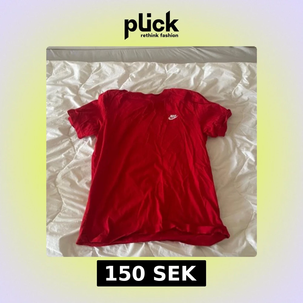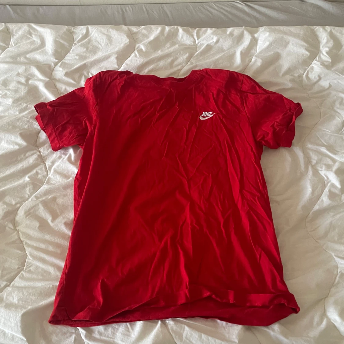 Säljer en röd t-shirt från Nike med klassisk vit logga på bröstet. T-shirten har en enkel design med rund hals och korta ärmar. Perfekt för en sportig och avslappnad stil.