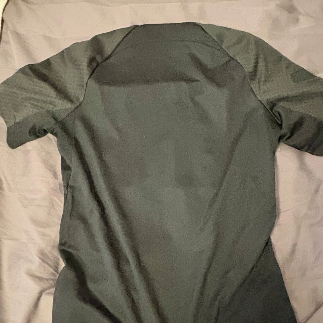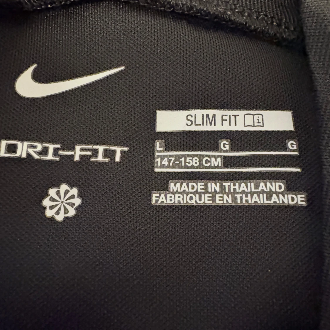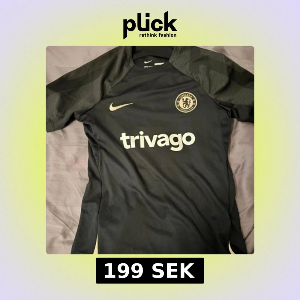 Chelsea FC svart fotbollströja från Nike i slim fit-modell. Tröjan har korta ärmar, Dri-Fit-material som andas och tryckt trivago-logga på bröstet. Chelsea-emblem och Nike swoosh i vitt framtill. Perfekt för träning eller match. Har blivit för liten för mig. STORLEK L I BARN, inte Herr