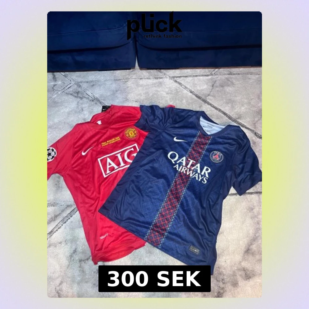 Två snygga fotbollströjor från Nike: en röd Manchester United med AIG-logga och Champions League-märke på ärmen, samt en marinblå PSG med Qatar Airways-tryck och mönstrad rand över bröstet. Perfekt för dig som älskar fotboll och vill representera ditt favoritlag.