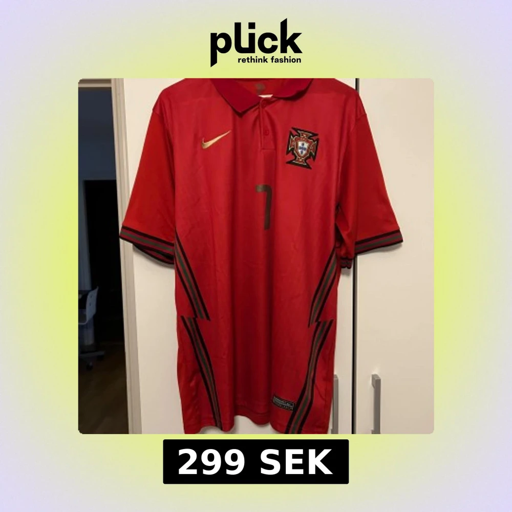 Portugal fotbollströja med Ronaldo 7 på ryggen. Röd med svarta och gröna detaljer på ärmarna, guldigt Nike-märke och nummer. Klassisk krage och korta ärmar. Perfekt för dig som vill representera landslaget och hylla Ronaldo.