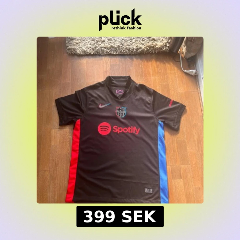 Snygg svart FC Barcelona fotbollströja från Nike med klubbmärke och röd Nike-logga på bröstet. Spotify-logga i rött framtill och röda samt blå sidopaneler. Tillverkad i lätt och ventilerande material, perfekt för match eller träning.
