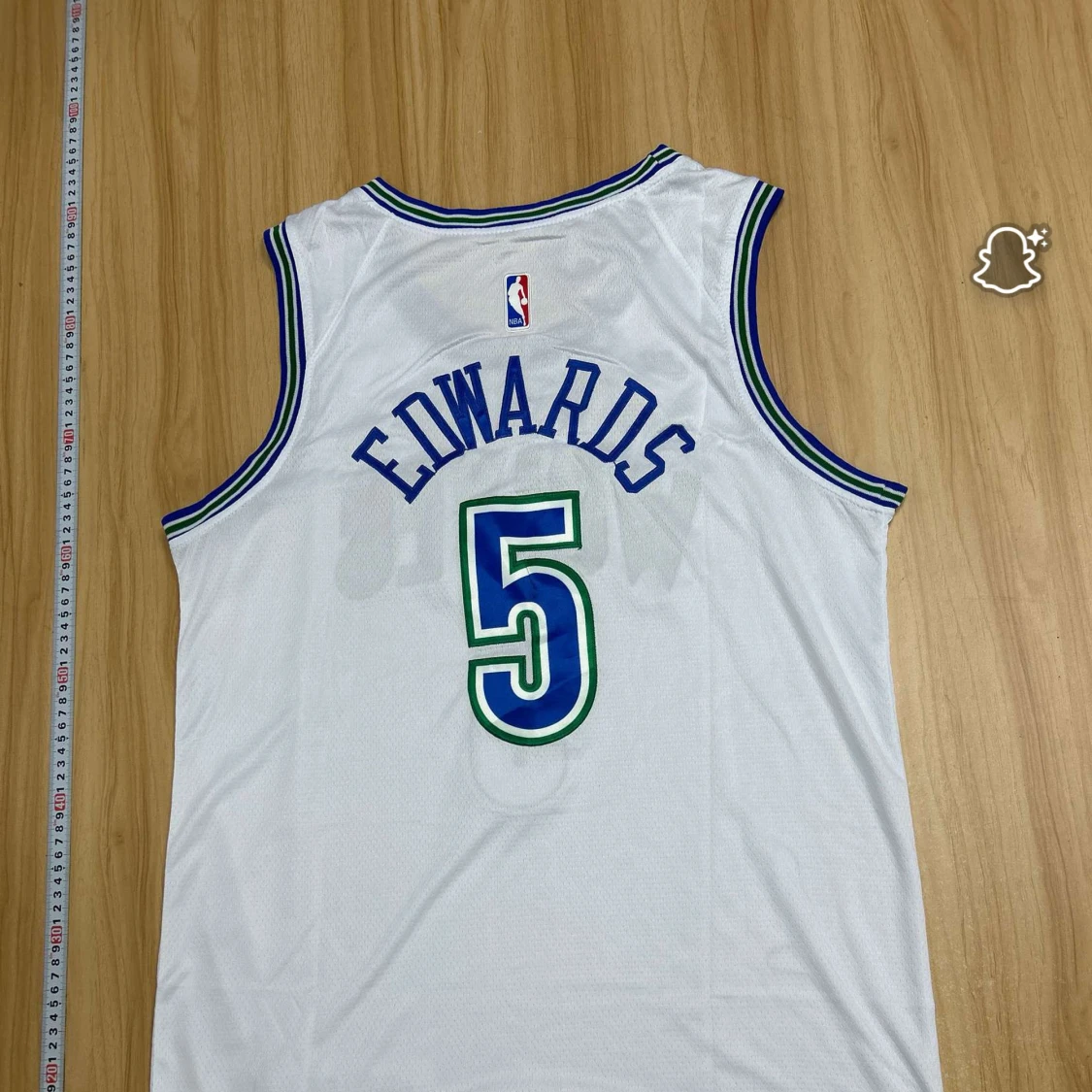 Snygg vit baskettröja från Nike med blå och gröna detaljer, Wolves-tryck på framsidan och Edwards samt nummer 5 på ryggen. Ärmlös modell med blå/gröna ränder runt hals och ärmhål. Officiell NBA patch nedtill. Perfekt för dig som gillar basket och streetwear.