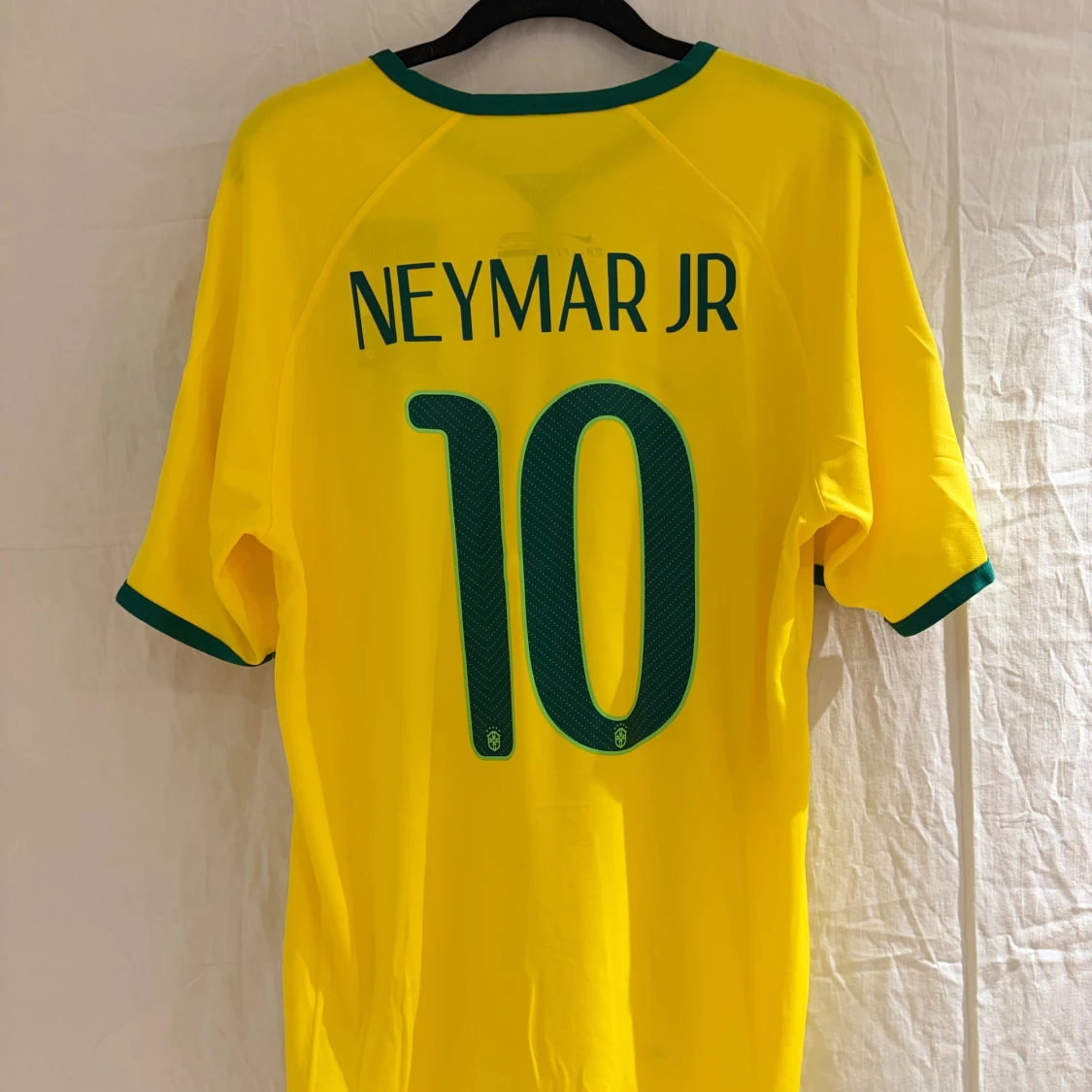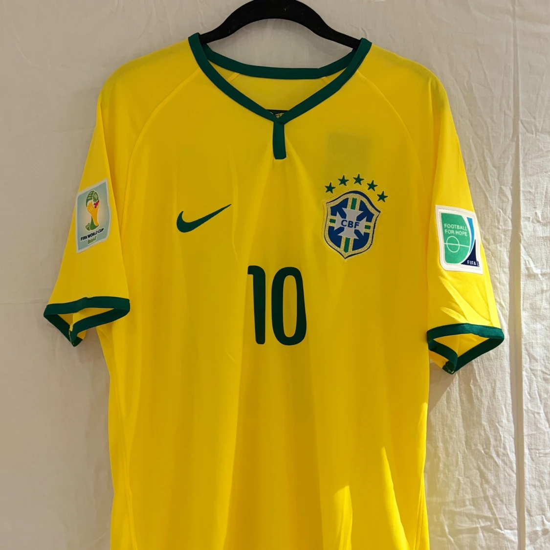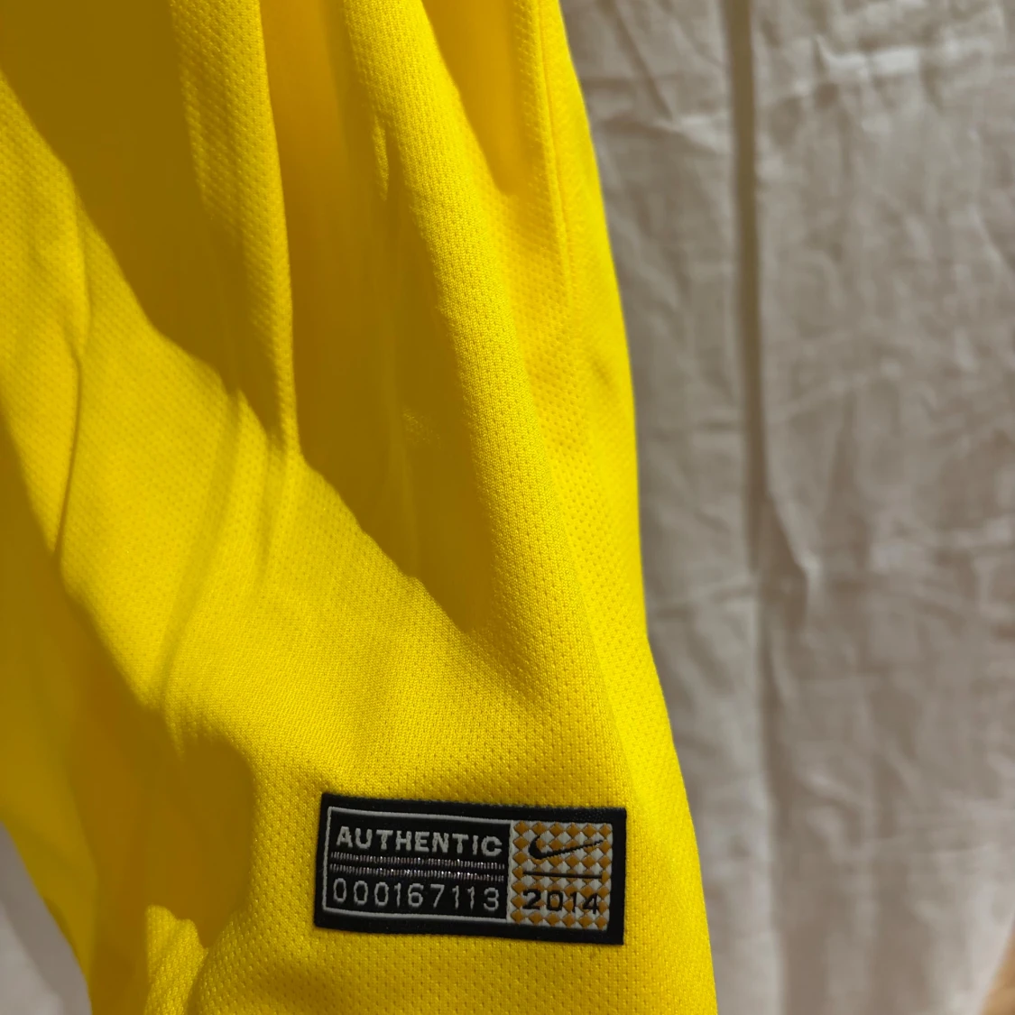 En retro Brasilien fotbollströja från VM 2014 med Neymar JR och nummer 10 på ryggen. Tröjan är gul med gröna detaljer, har korta ärmar och är tillverkad i Nike Dri-Fit material. Brasilien märker är broderat på bröstet.