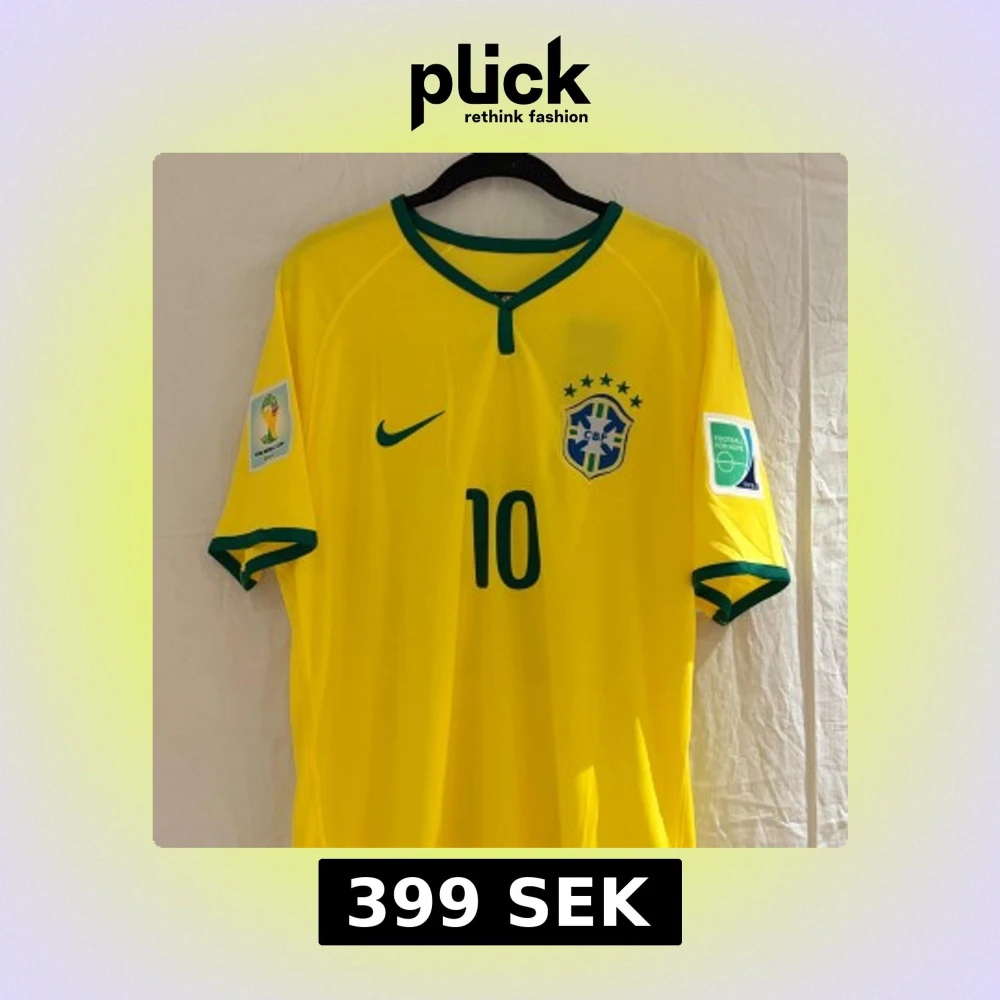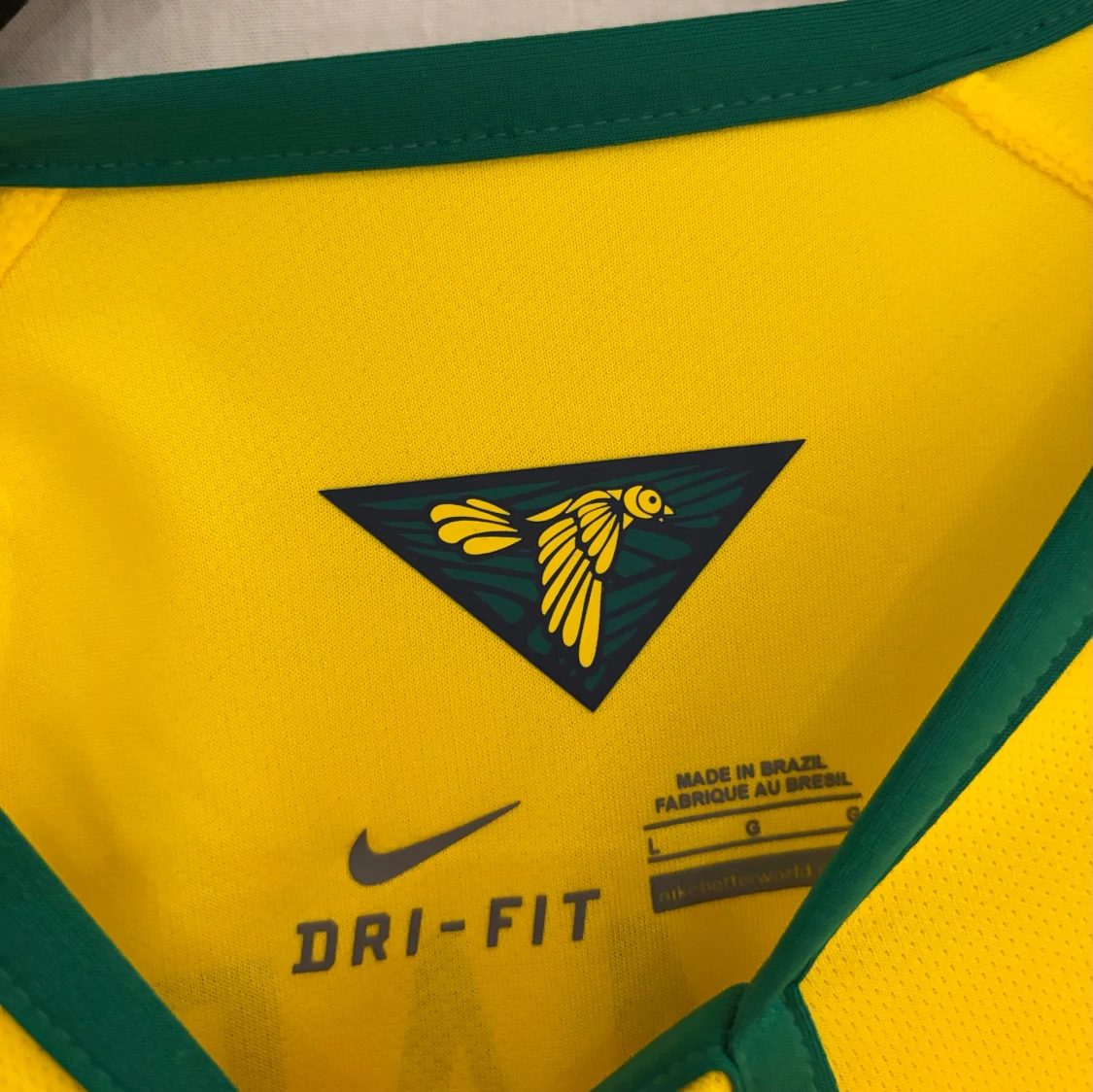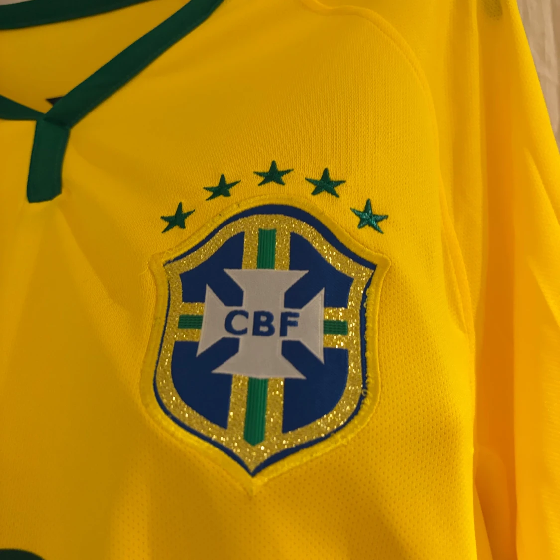 En retro Brasilien fotbollströja från VM 2014 med Neymar JR och nummer 10 på ryggen. Tröjan är gul med gröna detaljer, har korta ärmar och är tillverkad i Nike Dri-Fit material. Brasilien märker är broderat på bröstet.