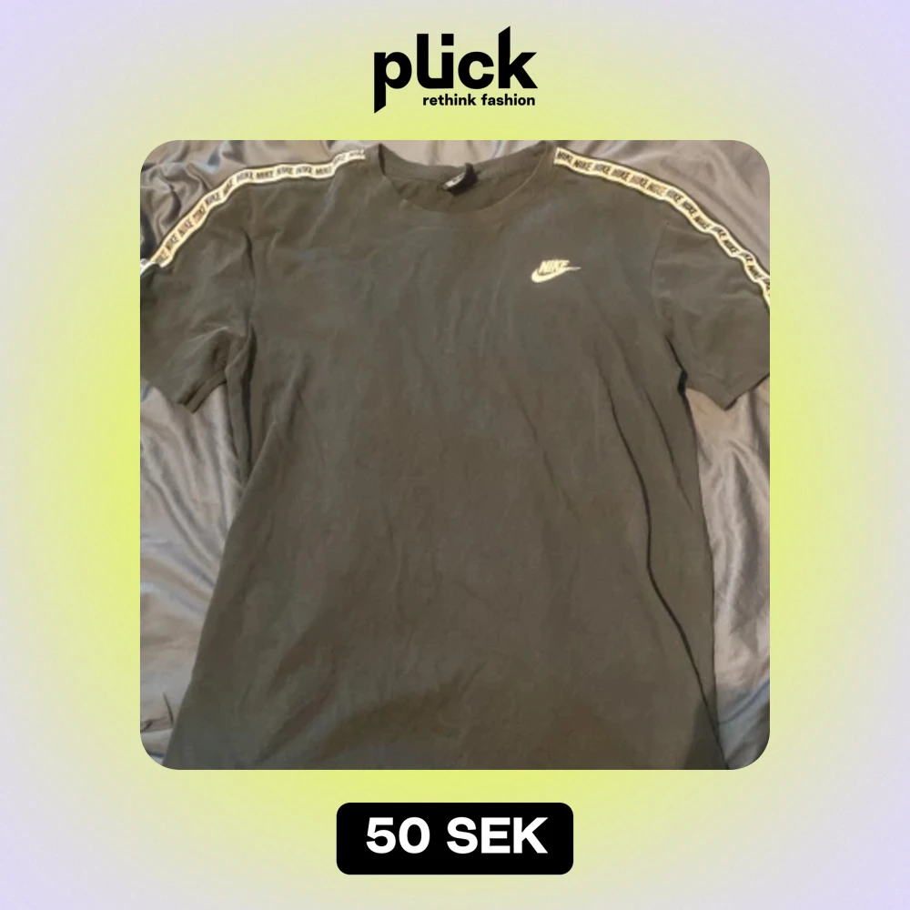 Säljer en svart t-shirt från Nike i storlek M. Den har korta ärmar och ett klassiskt Nike-logotyp tryck på bröstet. På axlarna finns en snygg detalj med Nike-text längs med hela bandet. Perfekt för en casual look eller träning!