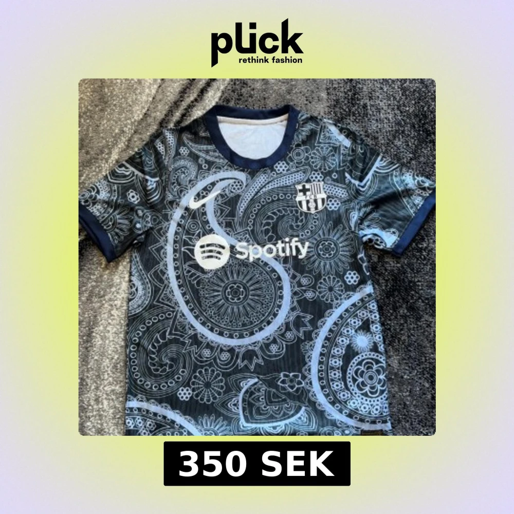 Snygg Barcelona fotbollströja med Spotify-logga och paisleymönster i blått och svart. Kortärmad modell med klubbmärke på bröstet och rund halsringning. Perfekt för dig som vill sticka ut på planen eller på läktaren.