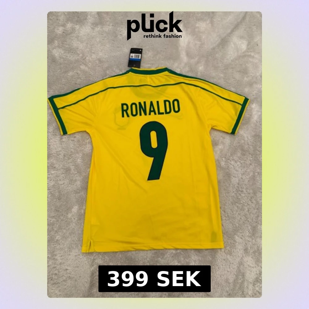 Gul Brasilien fotbollströja med gröna detaljer, nummer 9 och Ronaldo på ryggen. Nike-logga och Brasilien-emblem med fem stjärnor på bröstet. Klassisk rund hals och korta ärmar. Tillverkad i lätt polyester med NikeFit-teknologi för skön känsla.