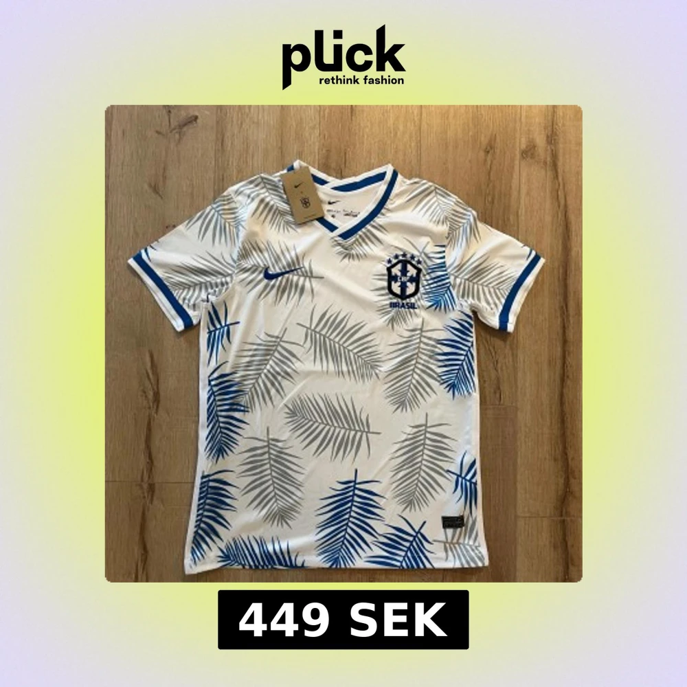 Snygg Brasilien fotbollströja från Nike i vitt med blå och grå palmbladsmönster. Tröjan har korta ärmar, V-ringad krage med blå kant och broderat CBF-märke på bröstet. Tillverkad i Dri-FIT material som andas, perfekt för match eller träning.