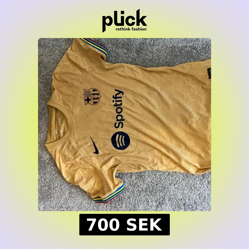 Säljer en officiell FC Barcelona fotbollströja från Nike i guld med mörkblå detaljer. Tröjan har korta ärmar med färgglada ränder vid ärmslut, klubbmärke och sponsortryck på bröstet samt UNHCR-tryck på ryggen. Materialet är lätt och andas, perfekt för match eller träning.