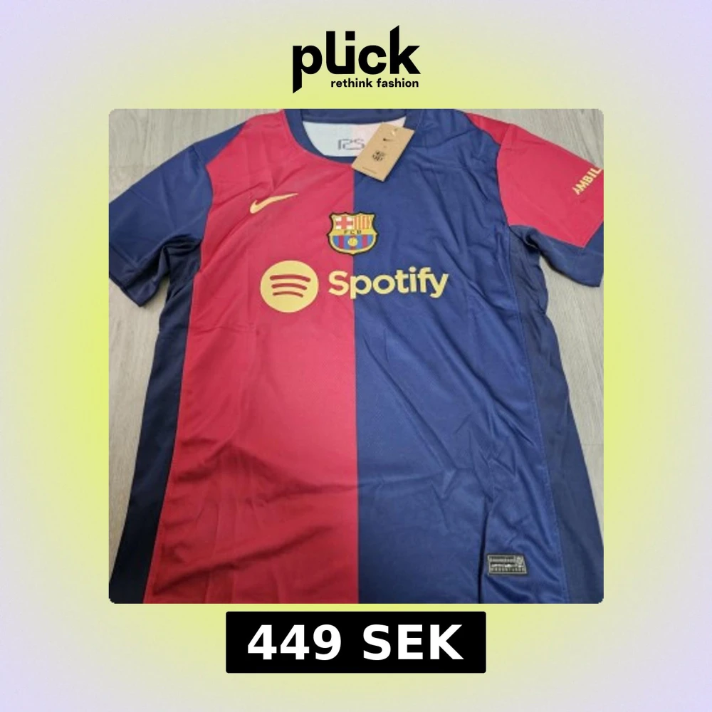 Säljer en FC Barcelona hemmatröja från säsongen 2023/24 med Spotify som sponsor. Tröjan är röd och blå, har klubbmärke och Nike-logga på bröstet samt UNHCR-tryck på ryggen. Klassisk design med korta ärmar och rund hals.