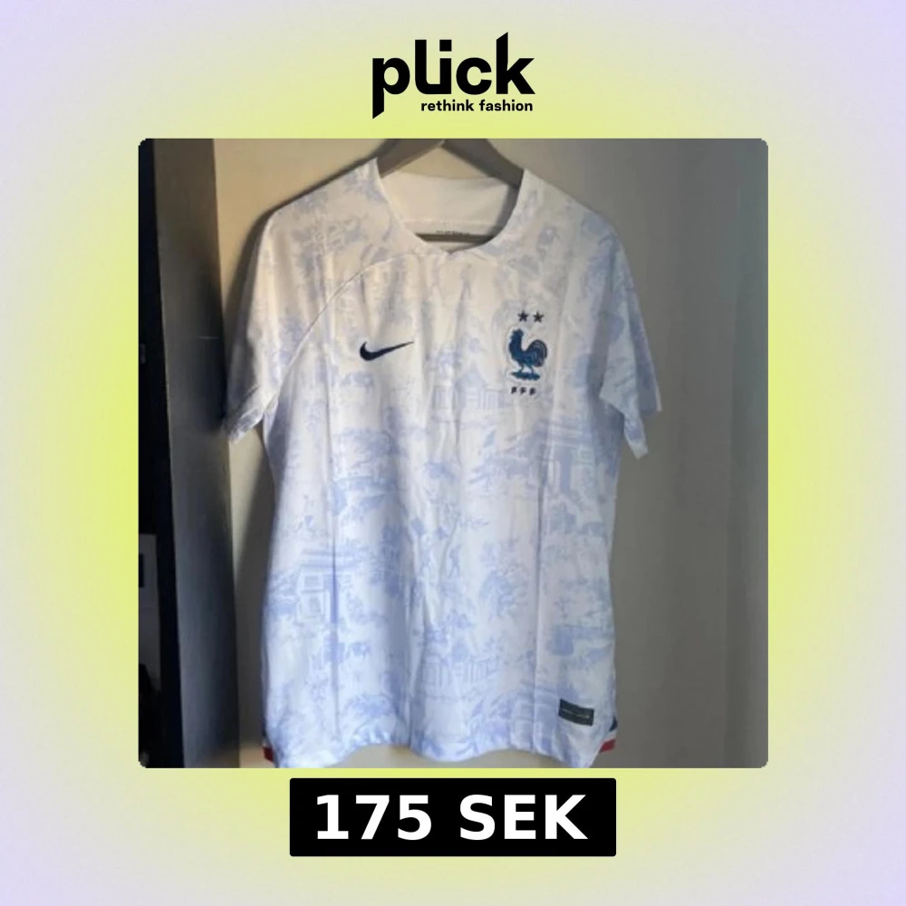 Säljer en officiell Frankrike fotbollströja från Nike i vitt med ljusblått mönster. Tröjan har korta ärmar, broderad tupp-logga och två stjärnor på bröstet. Materialet är lätt och andas, perfekt för match eller träning. Pris går att diskuteras