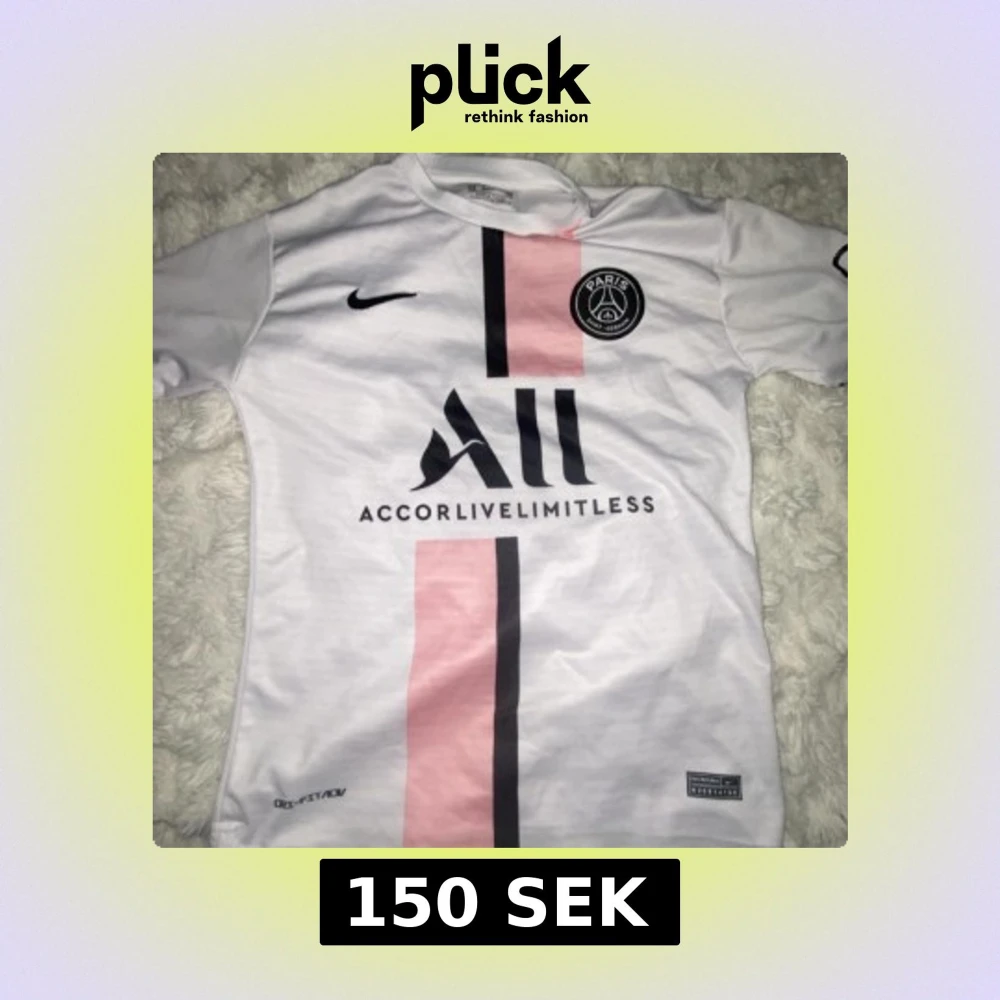 Snygg PSG fotbollströja från Nike med Messi 30-tryck på ryggen. Tröjan är vit med en rosa och svart vertikal rand på framsidan, PSG-emblem på bröstet och sponsortryck. Tillverkad i lätt och ventilerande material, perfekt för fotbollsplanen eller att bära tröjan på en varm dag. Strl M men kan passar Strl S