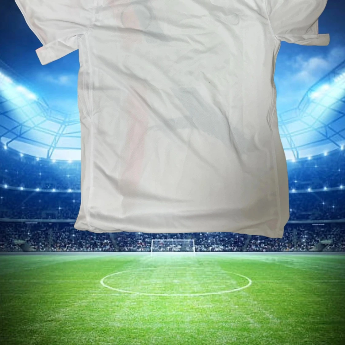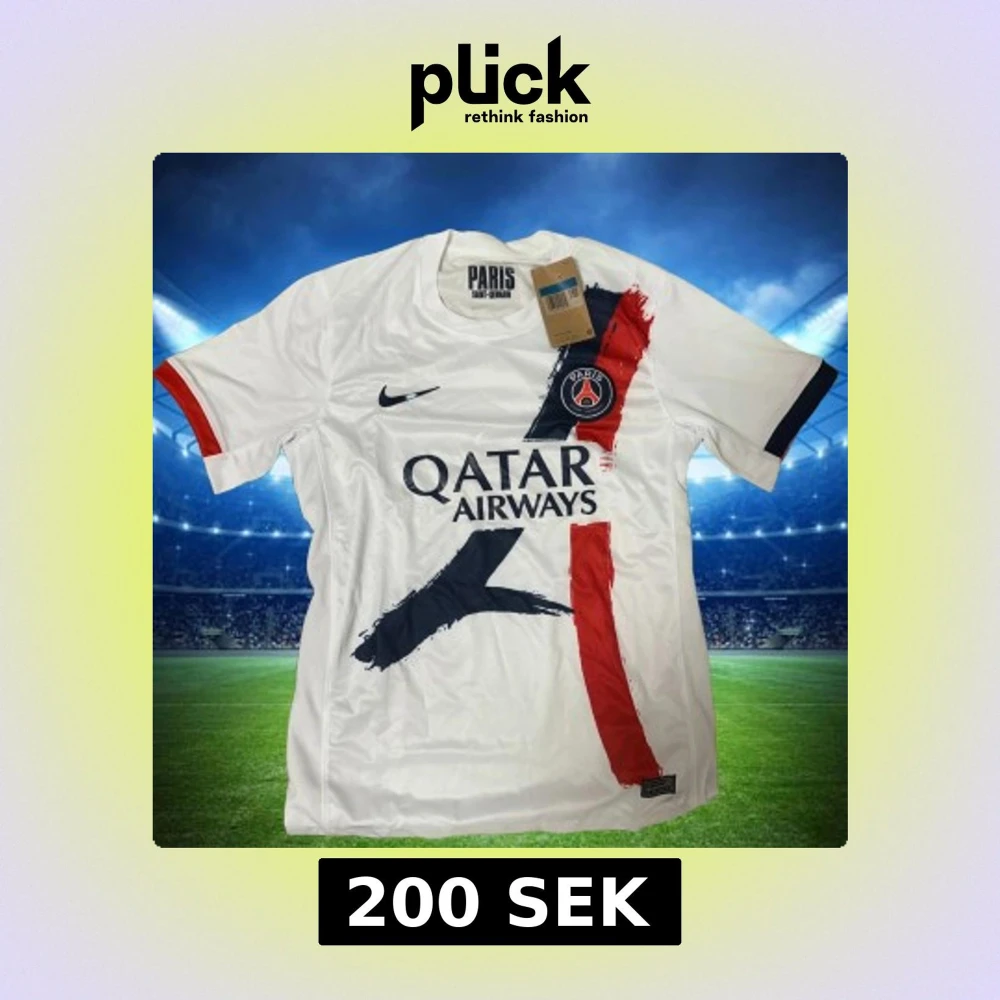 Paris Saint-Germain fotbollströja i vitt med coola penseldrag i rött och mörkblått framtill. PSG-logga på bröstet, Nike Swoosh och Qatar Airways som sponsor. Kortärmad modell i lätt och ventilerande material, perfekt för match eller träning.