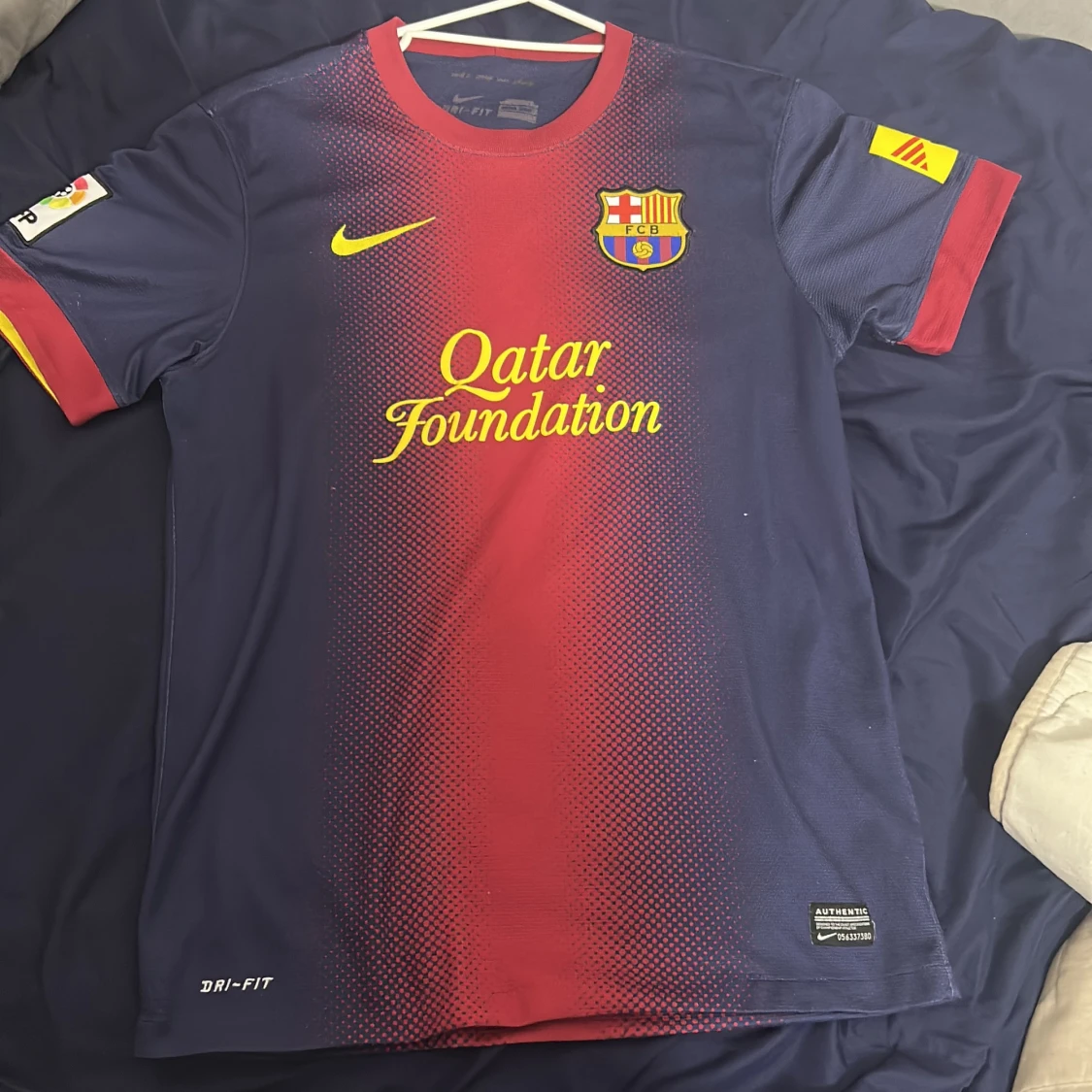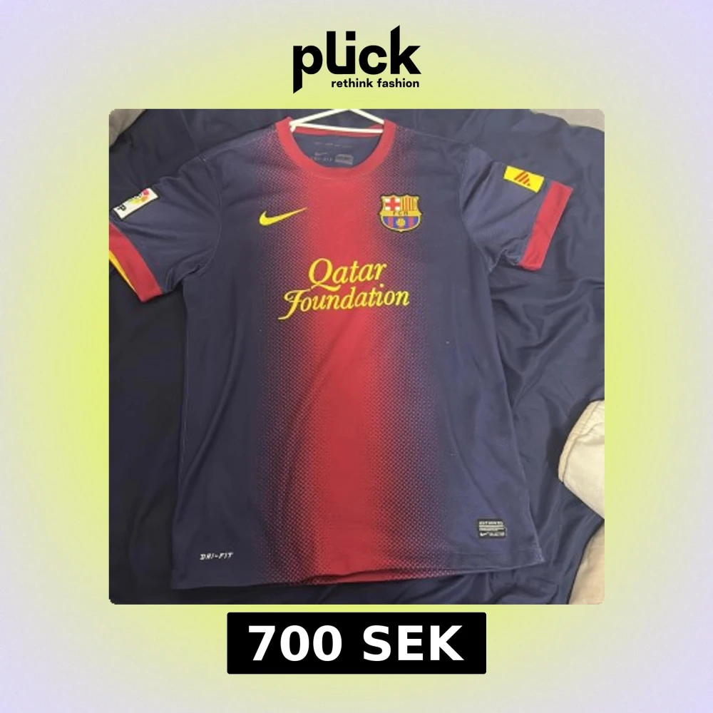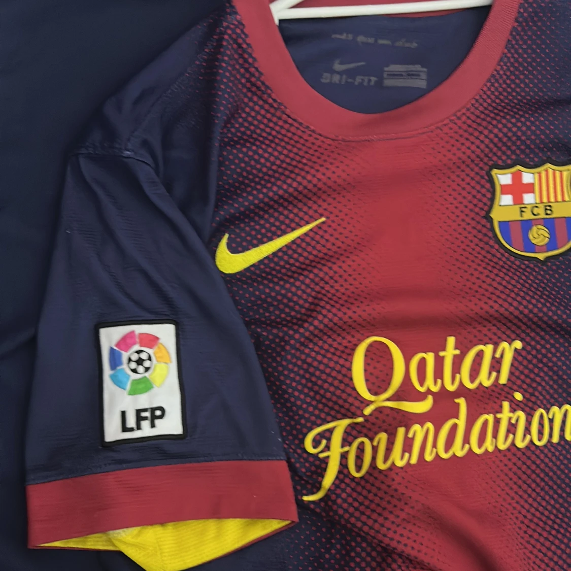 Säljer en FC Barcelona matchtröja från Nike med Dri-Fit material. Tröjan är marinblå med röd mitt och gula detaljer, har korta ärmar och rund hals. Framsidan har Qatar Foundation-tryck och klubbmärke, baksidan har UNICEF-tryck. Snyggt prickigt mönster över bröstet.