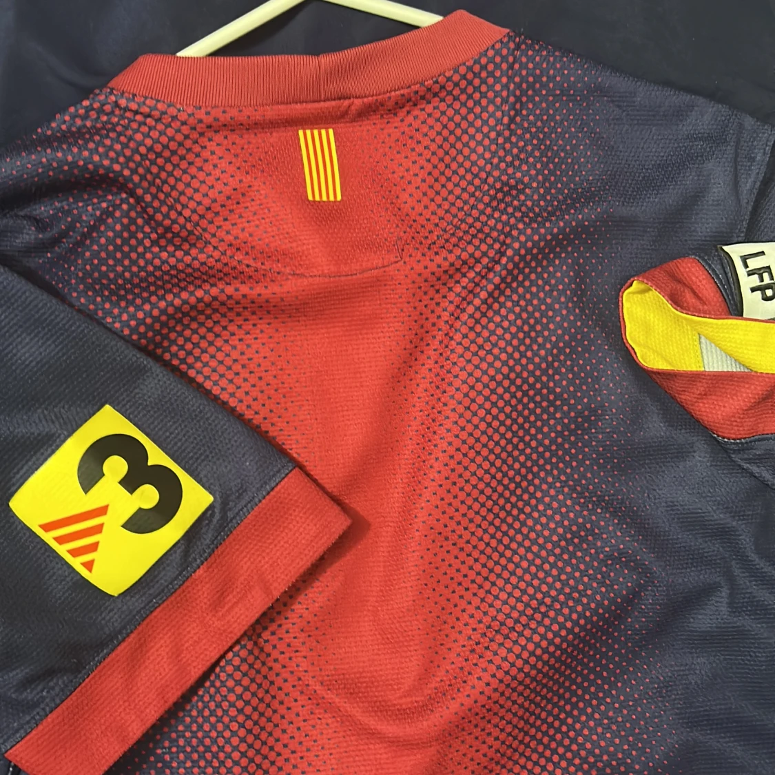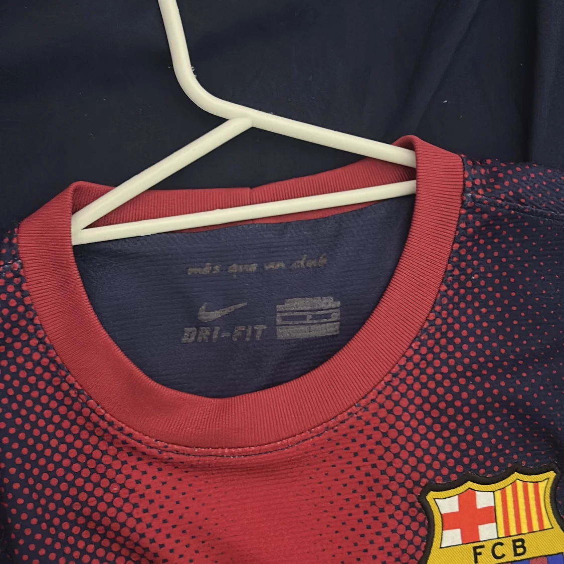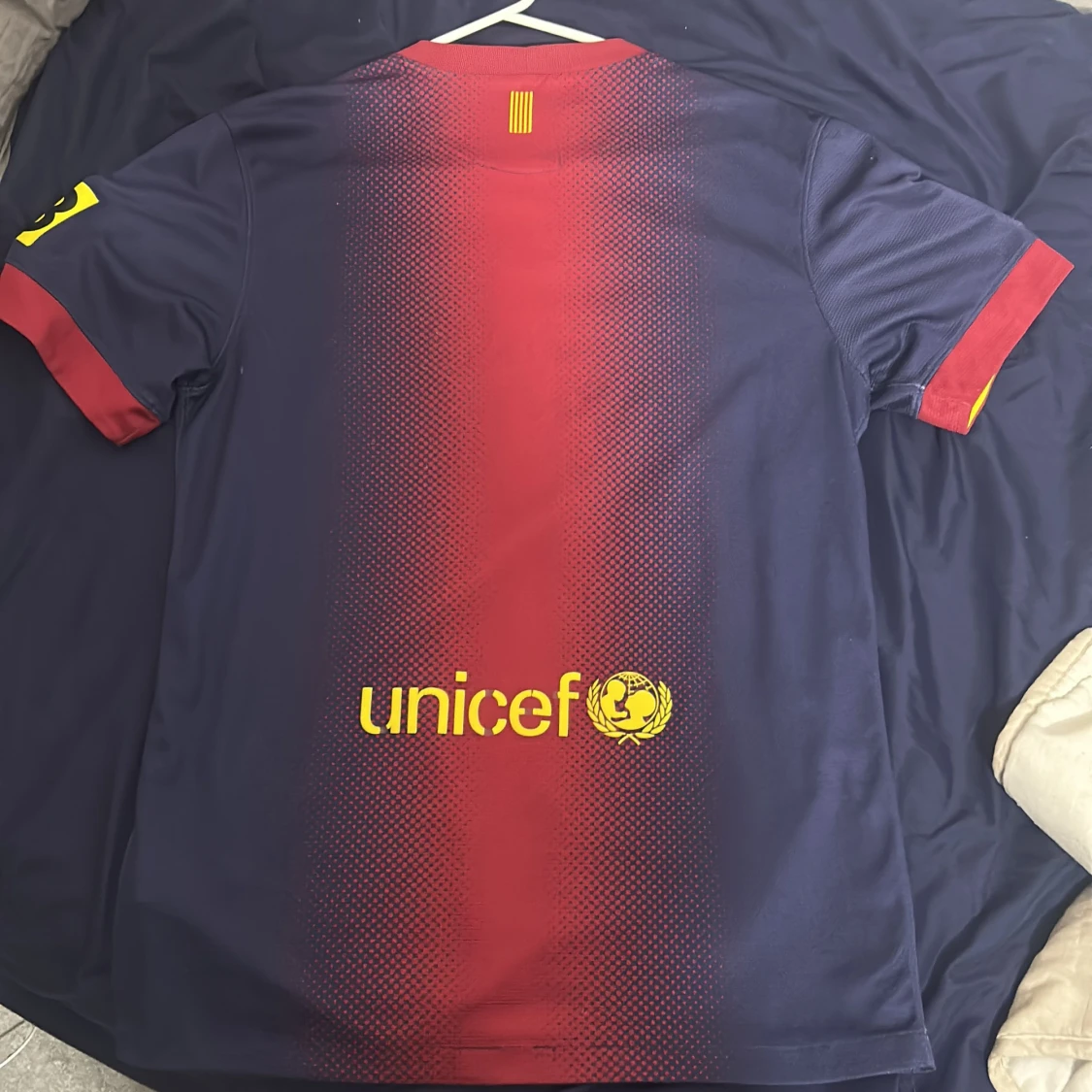 Säljer en FC Barcelona matchtröja från Nike med Dri-Fit material. Tröjan är marinblå med röd mitt och gula detaljer, har korta ärmar och rund hals. Framsidan har Qatar Foundation-tryck och klubbmärke, baksidan har UNICEF-tryck. Snyggt prickigt mönster över bröstet.