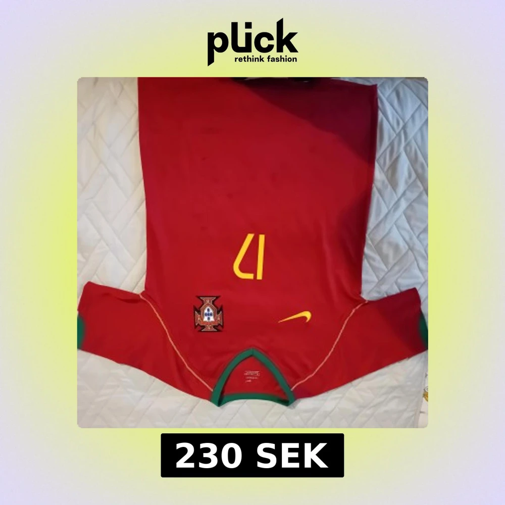Säljer en klassisk röd Portugal fotbollströja från Nike med nummer 17 och C. Ronaldo på ryggen. Tröjan har gula detaljer, gröna muddar och Portugals landslagsemblem på bröstet. Perfekt för dig som älskar fotboll och Ronaldo.