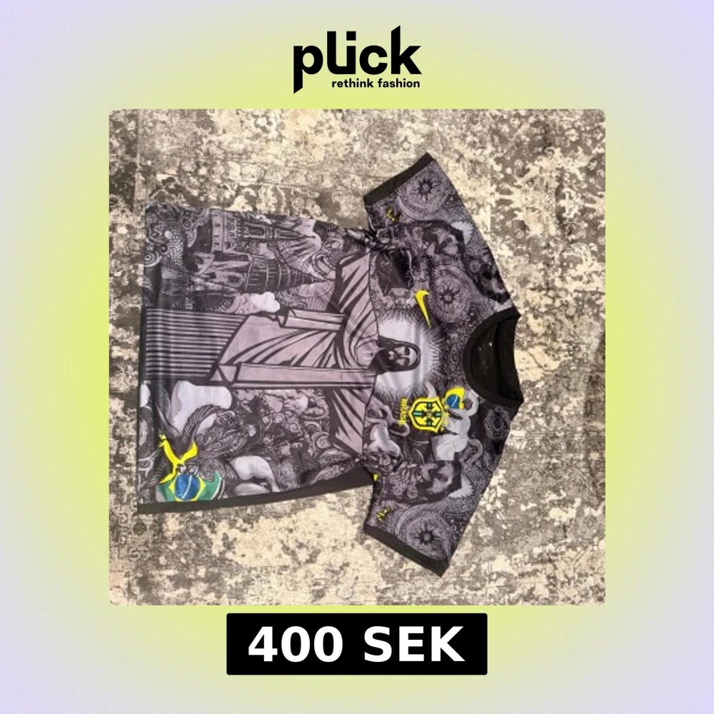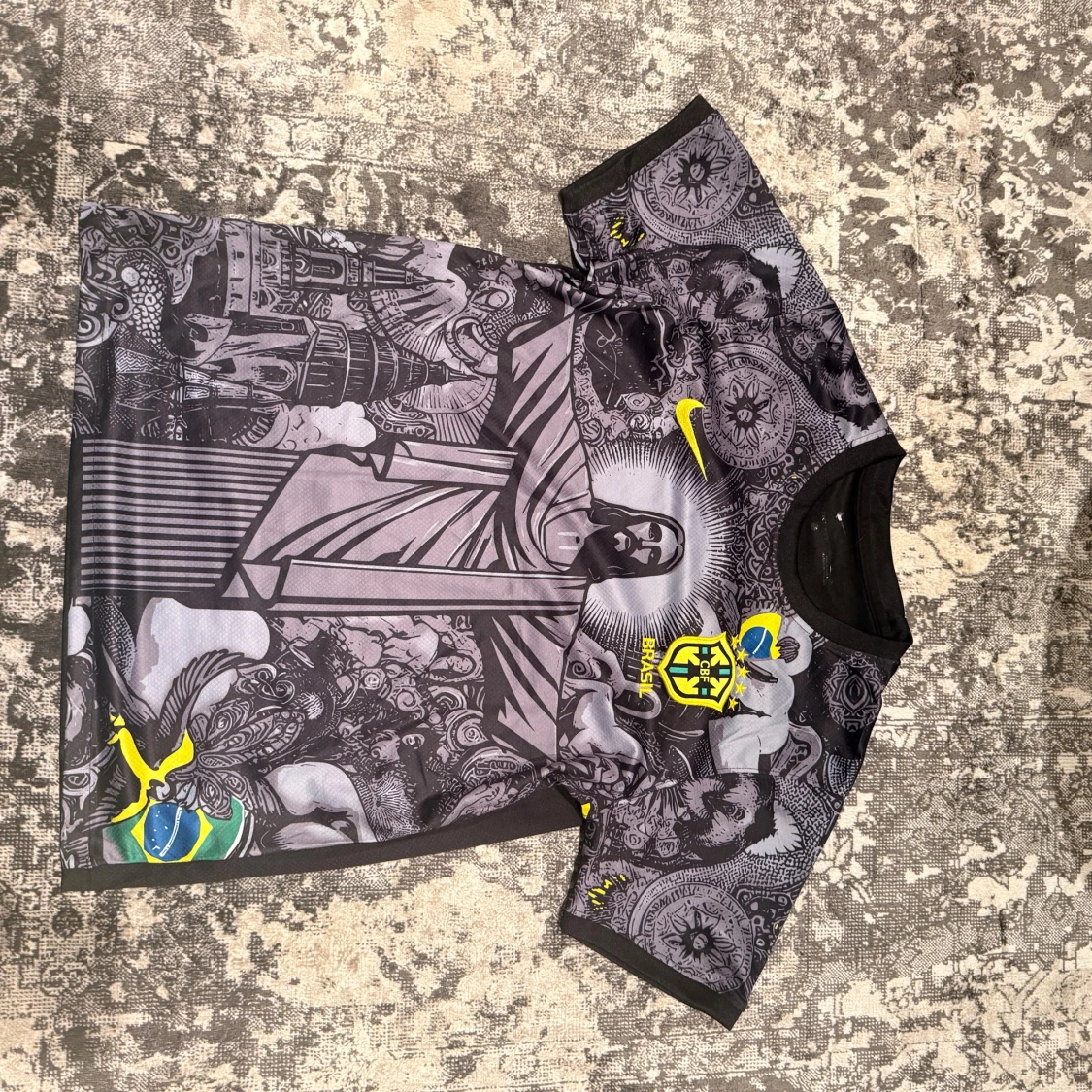 Unik svart och grå Brasilien fotbollströja från Nike med detaljerat grafiskt mönster som inkluderar Kristusstatyn och brasilianska symboler. Kortärmad modell med gul Nike-logga och Brasilien-emblem på bröstet. Perfekt för dig som vill sticka ut på planen.