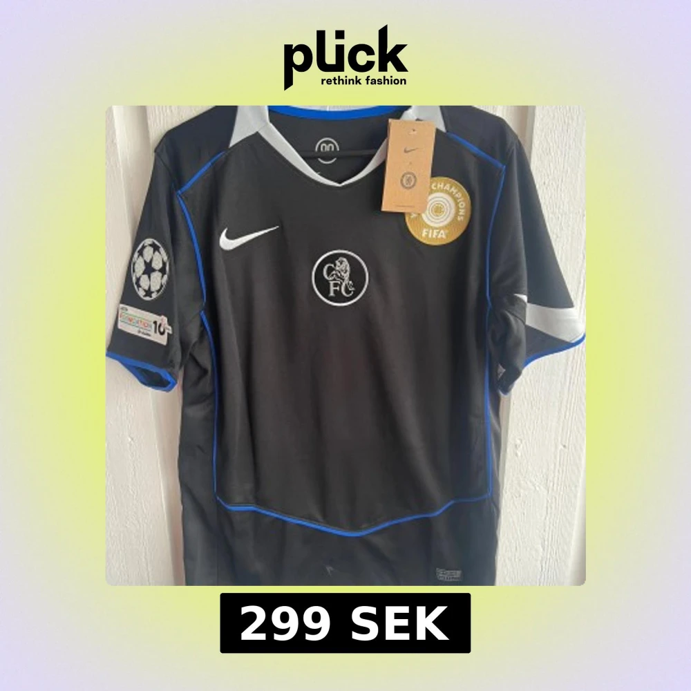 Chelsea FC fotbollströja med Palmer 10 på ryggen. Svart med blå och grå detaljer, officiella Champions League och FIFA Champions-märken på ärmar och bröst. Nike-logga och Chelsea-emblem framtill. Tillverkad i lätt och ventilerande material.