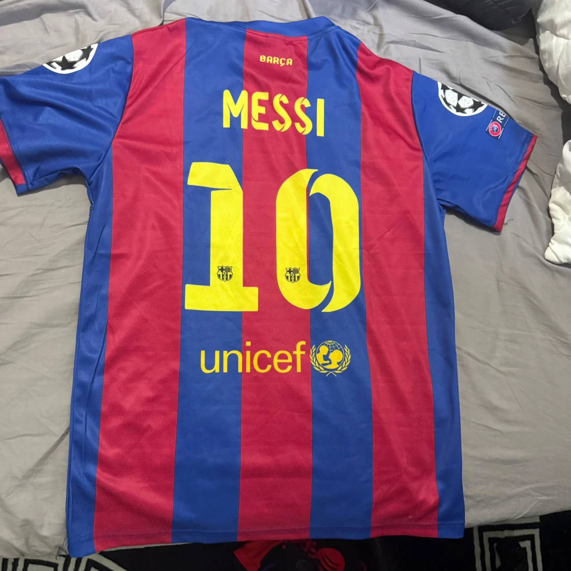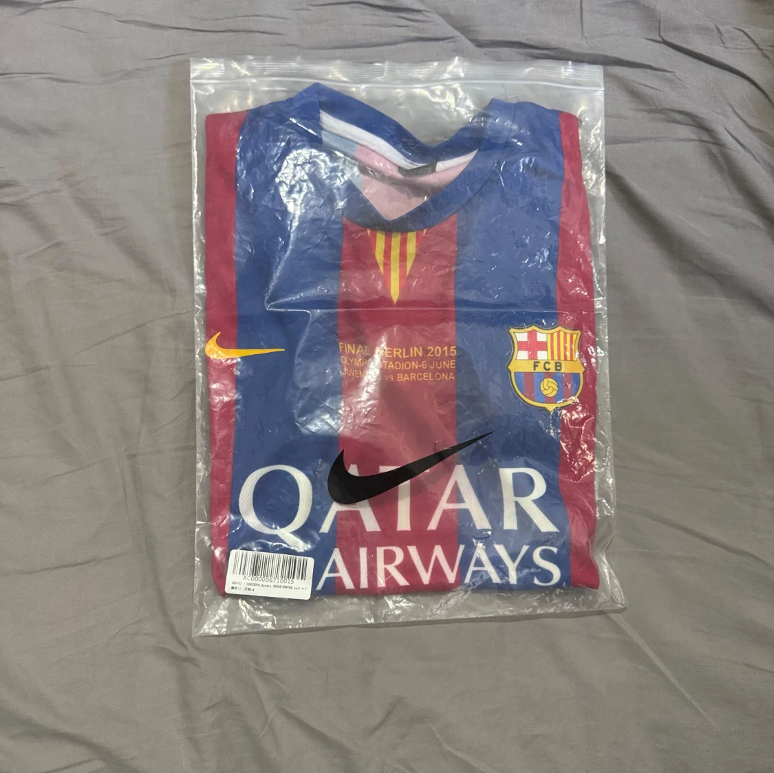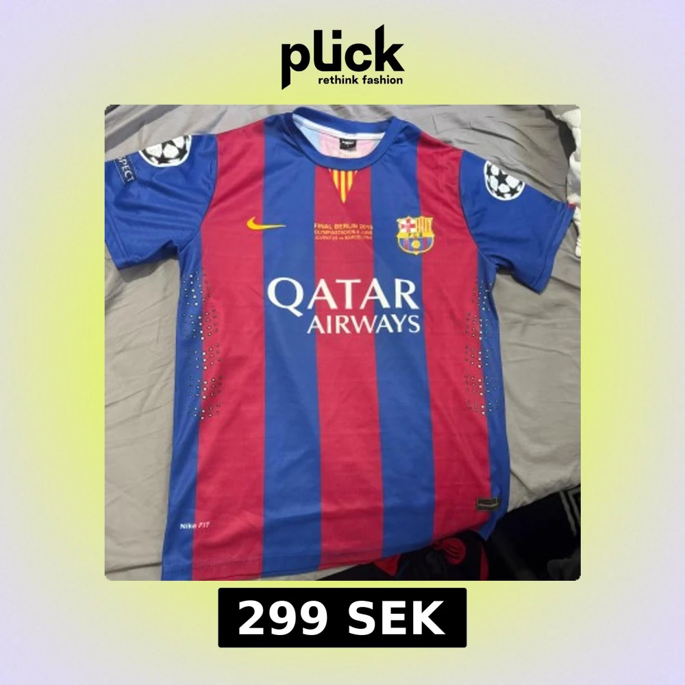 Säljer en officiell FC Barcelona fotbollströja från Champions League-finalen 2015 med Messi 10 på ryggen. Tröjan är randig i blått och rött med gula detaljer, klubbmärke och Qatar Airways tryck på bröstet. Tillverkad i lätt polyester med korta ärmar och Nike FIT-teknologi.