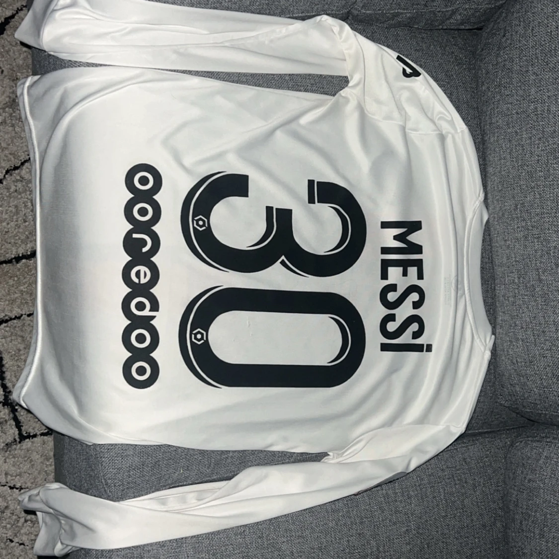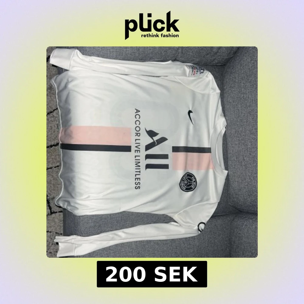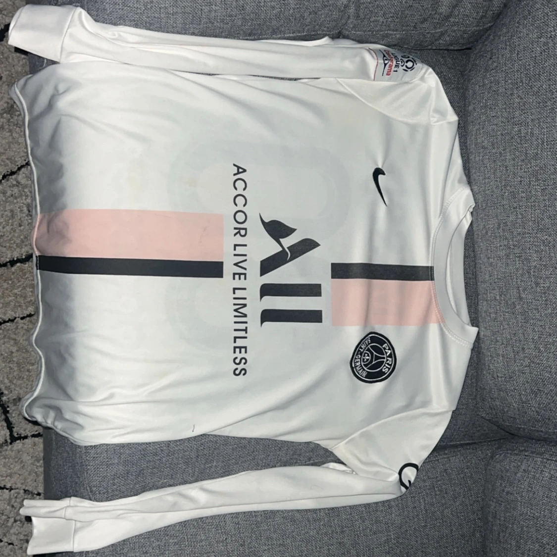Säljer en vit långärmad PSG 21/22 fotbollströja från Nike med rosa och svarta detaljer. Tröjan har Messis spelarnummer framsidan. Perfekt för fotbollsfans!! Ganska svårt och få tag på nu.