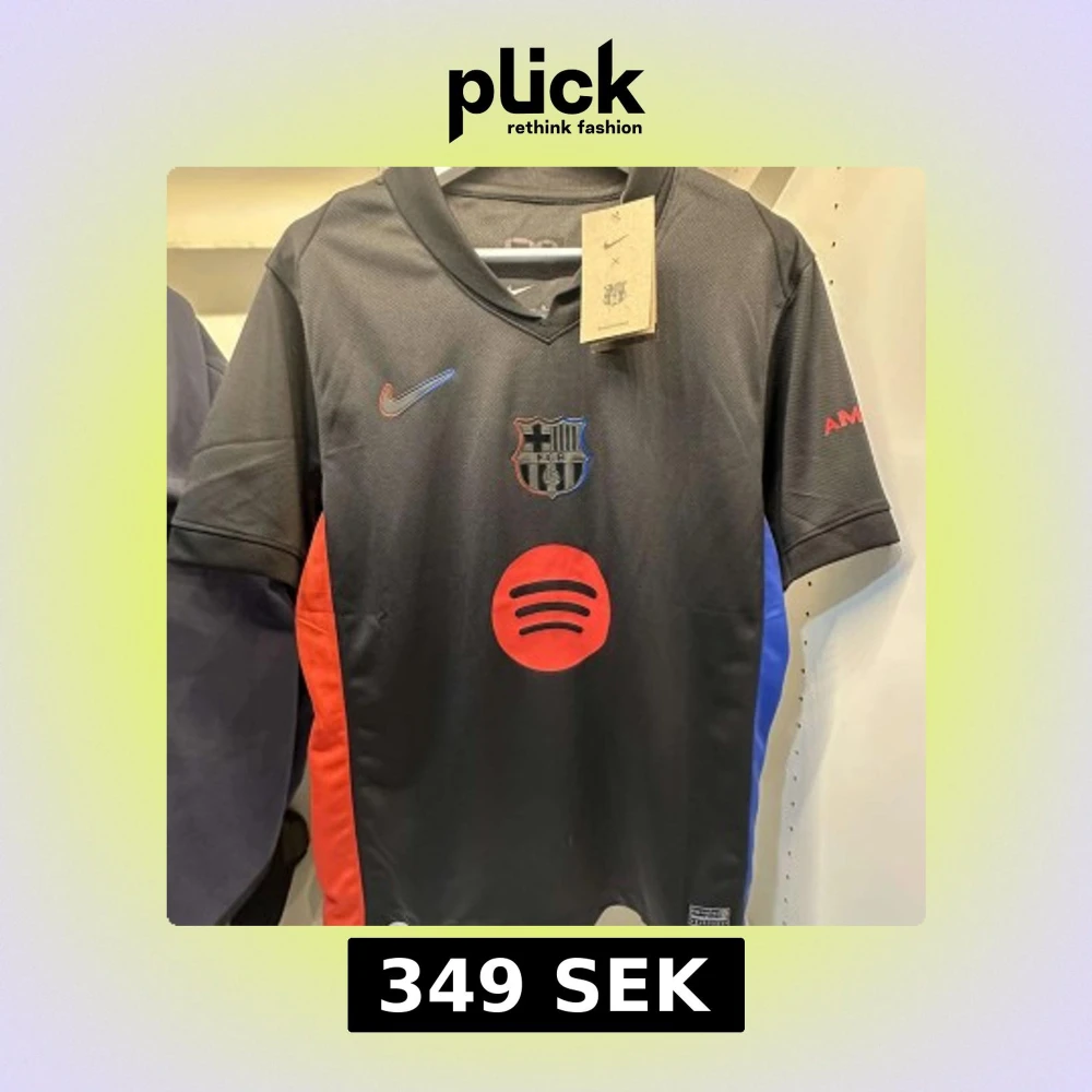 Snygg svart FC Barcelona fotbollströja från Nike med klubbmärke på bröstet, röd Spotify-logga och röda samt blå sidopaneler. Kortärmad modell i lätt och ventilerande material, perfekt för match eller träning. UNHCR-tryck på ryggen och detaljer i rött och blått.