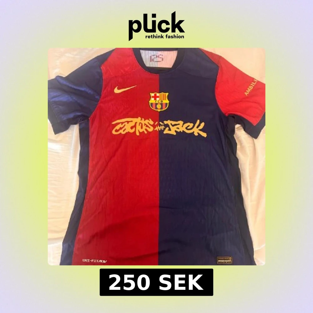 Säljer en FC Barcelona fotbollströja från Nike i samarbete med Cactus Jack. Tröjan har klassisk halva-halva design i rött och mörkblått, med gult tryck och klubbmärke på bröstet. Materialet är lätt och andas, perfekt för match eller träning.