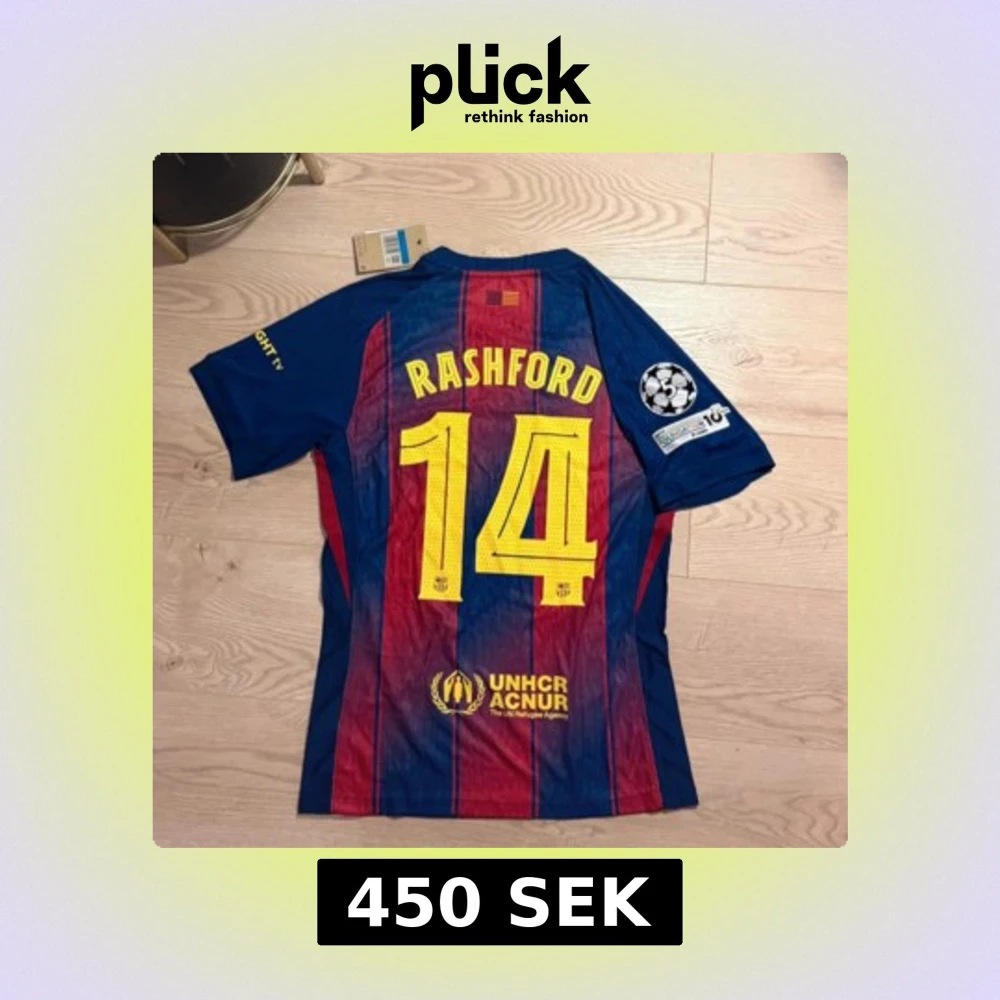 Säljer en officiell FC Barcelona fotbollströja från Nike i storlek M med Rashford och nummer 14 på ryggen. Tröjan har klassiska blå och röda vertikala ränder, gula detaljer och Champions League-märke på ärmen. Materialet är lätt och andas, perfekt för match eller träning.