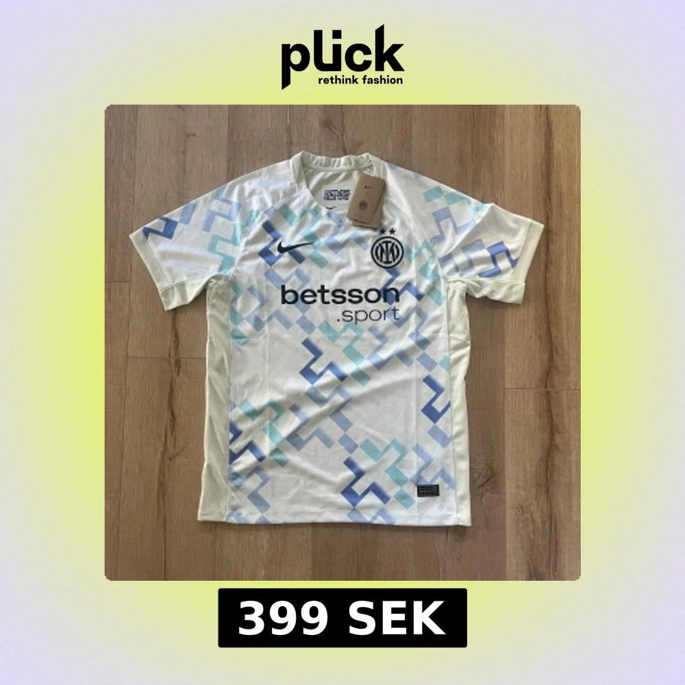 Inter fotbollströja från Nike i vitt med ljusblå och blå geometriskt mönster. Tröjan har korta ärmar, rund hals och broderat Inter-märke på bröstet. Materialet är lätt och andas, perfekt för match eller träning. Snygg detalj med 'Brothers + Sisters' tryck i nacken.