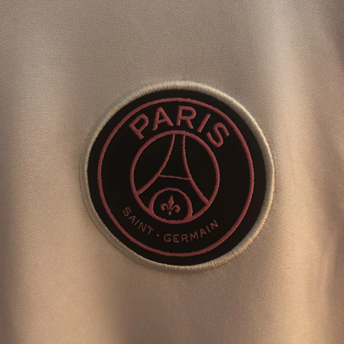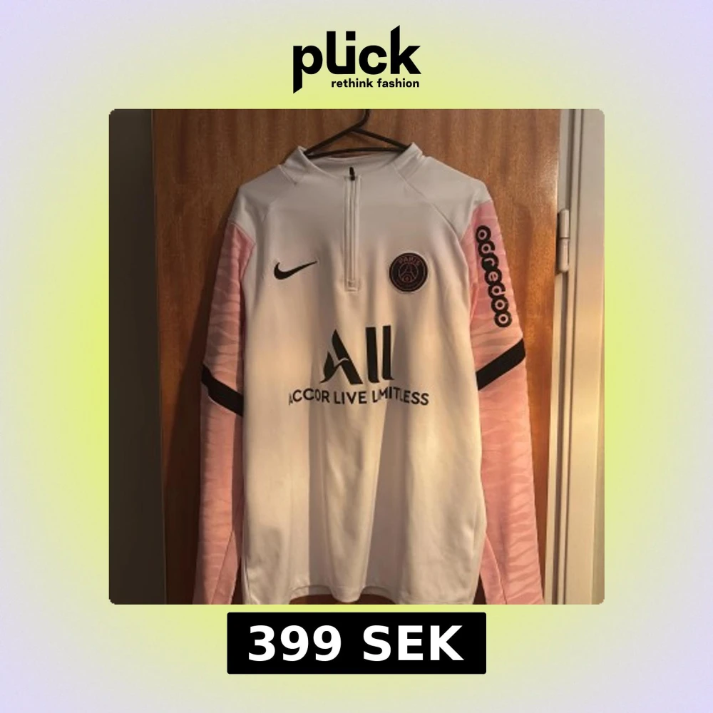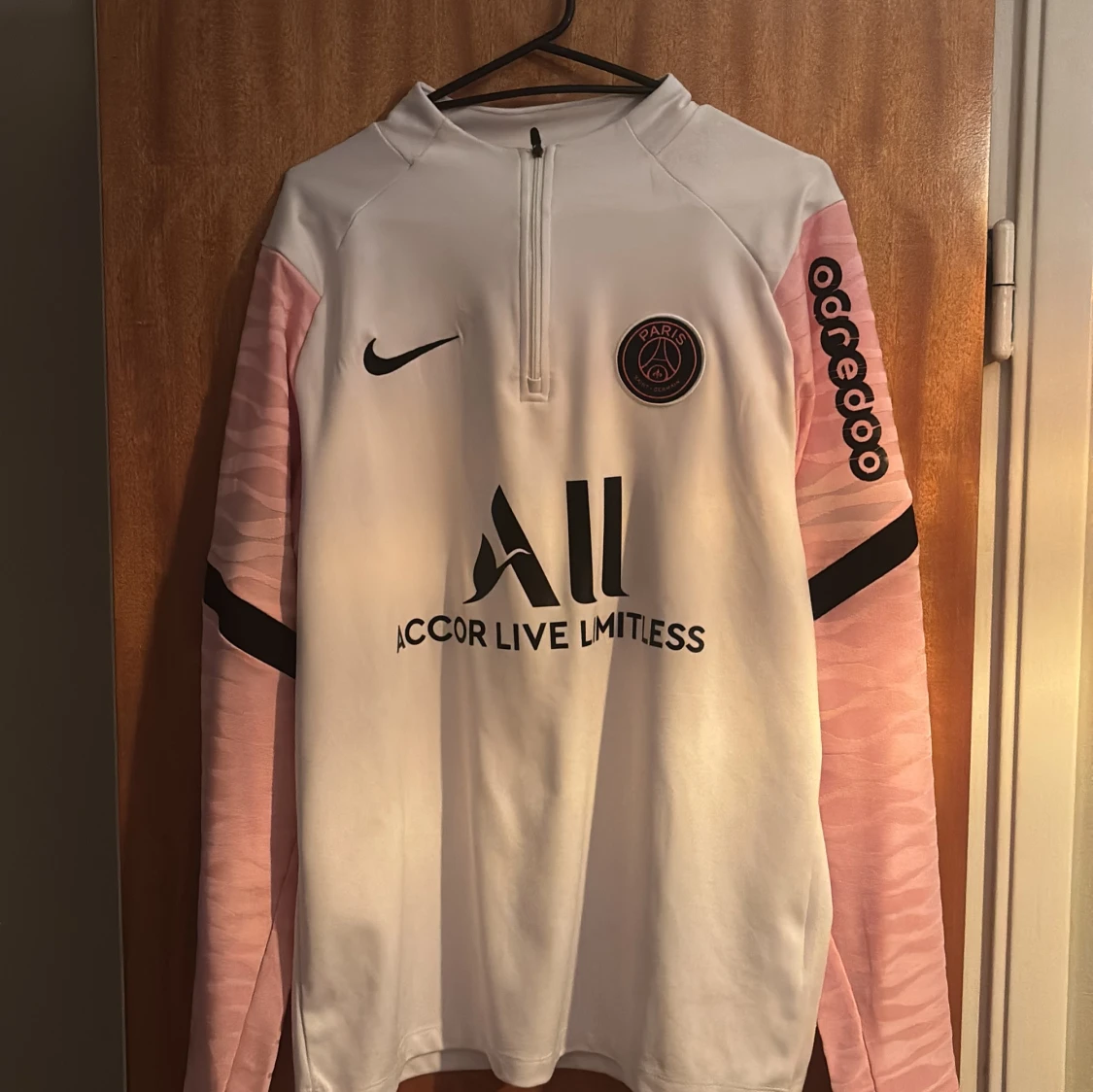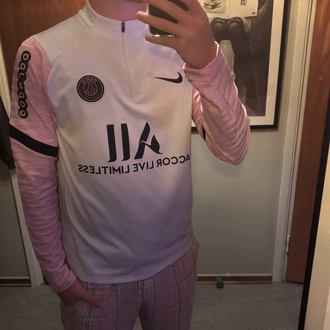 Säljer en snygg långärmad Paris Saint-Germain träningströja från Nike. Tröjan är vit med ljusrosa ärmar och svarta detaljer, PSG-logga på bröstet och sponsortryck. Materialet är mjukt och sportigt, perfekt för fotbollsträning.
