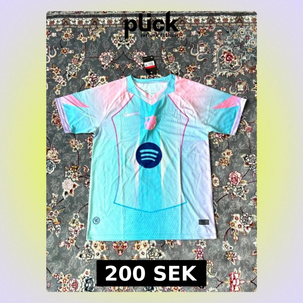 Säljer en unik FC Barcelona fotbollströja från Nike med Spotify-logga. Tröjan har korta ärmar och är tillverkad i lätt, ventilerande polyester. Färgerna är en mix av ljusblått, rosa och vitt med tunna linjer och pastelltoner. V-ringad krage och klubbmärke i holografisk stil framtill.