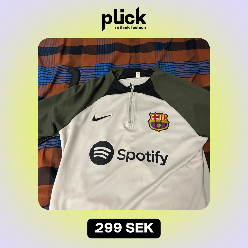 Säljer en snygg FC Barcelona tröja från Nike i vitt och grönt. Tröjan har korta ärmar och en dragkedja vid halsen. Den har klubbens emblem och Spotify-logga på framsidan. Perfekt för alla Barça-fans! ⚽