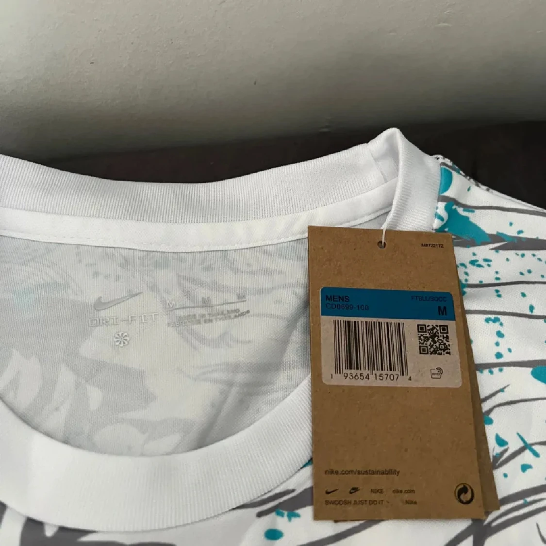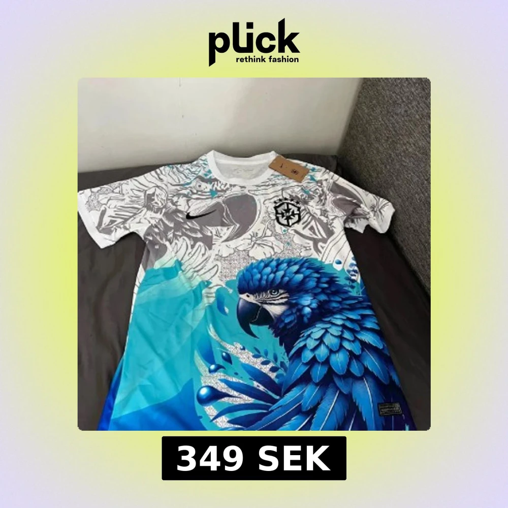 Unik Brasil fotbollströja från Nike med stor blå papegoja och tropiska mönster i vitt, grått och blått. Tröjan har korta ärmar, rund hals och är tillverkad i lätt Dri-FIT material som andas. Perfekt för dig som vill sticka ut på planen eller läktaren.