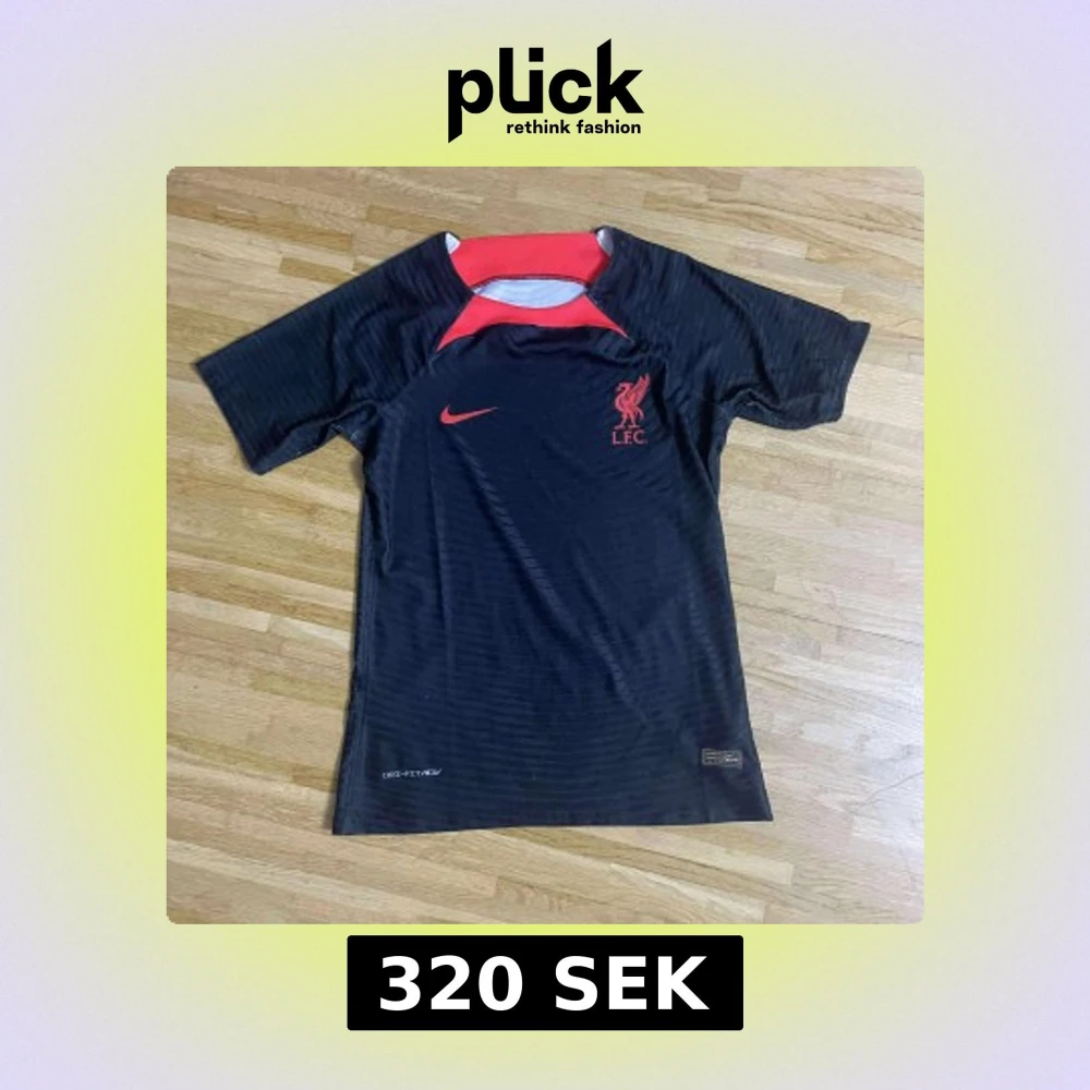 Svart fotbollströja från Nike med Liverpool FC-logga och röd Nike swoosh på bröstet. Tröjan har korta ärmar, röd detalj vid halsen och är tillverkad i ett lätt, ventilerande funktionsmaterial. Perfekt för dig som vill representera LFC både på och utanför planen.
