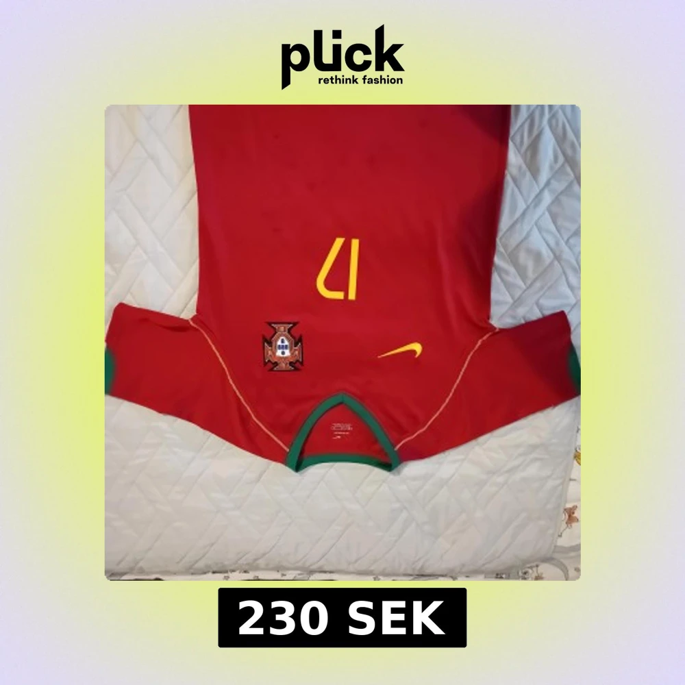 Säljer en klassisk Portugal fotbollströja från Nike med C. Ronaldo och nummer 17 på ryggen. Tröjan är röd med gula detaljer, gröna muddar och krage samt Portugals landslagsemblem på bröstet. Perfekt för dig som älskar fotboll och Ronaldo.
