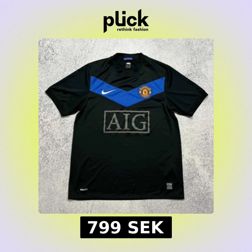Säljer en svart fotbollströja från Nike med blått V-mönster och Manchester Uniteds emblem på bröstet. Tröjan har korta ärmar och AIG-logga på framsidan. Perfekt för fans av laget!
