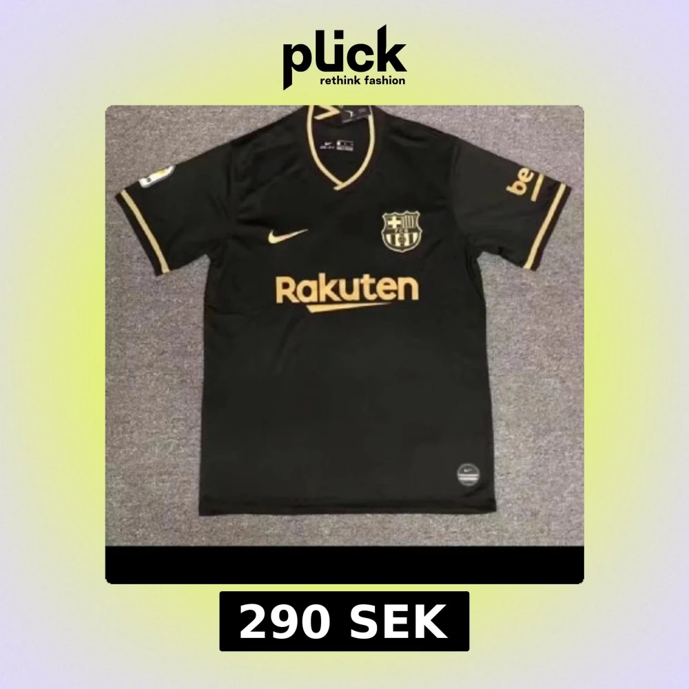 Snygg svart FC Barcelona fotbollströja från Nike med guldiga detaljer och loggor. Rakuten-tryck på bröstet, klubbmärke och Nike swoosh i guld. Kortärmad modell i lätt och ventilerande material, perfekt för match eller träning.