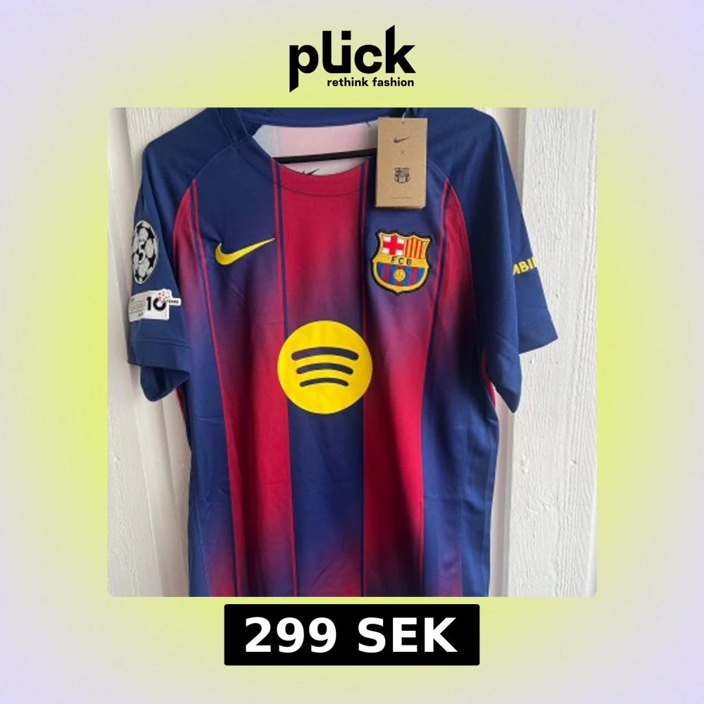 Säljer en officiell FC Barcelona matchtröja från Nike med klassiska blå och röda ränder, gula detaljer och klubbmärke på bröstet. Tröjan har korta ärmar, Champions League-märke på ärmen och stor gul 27:a på ryggen. Materialet är lätt och andas, perfekt för fotboll.