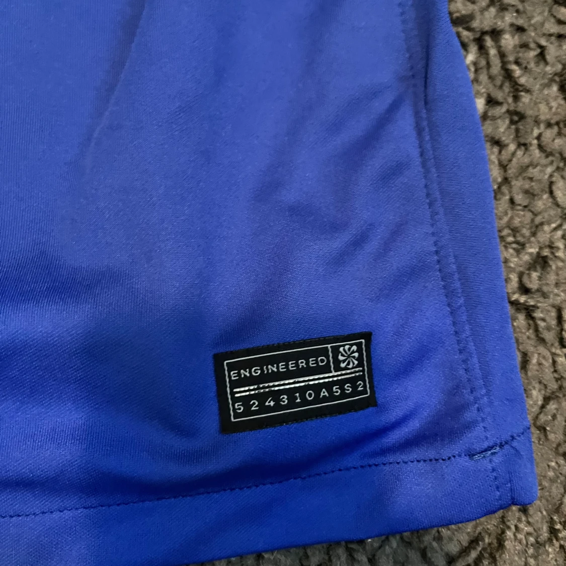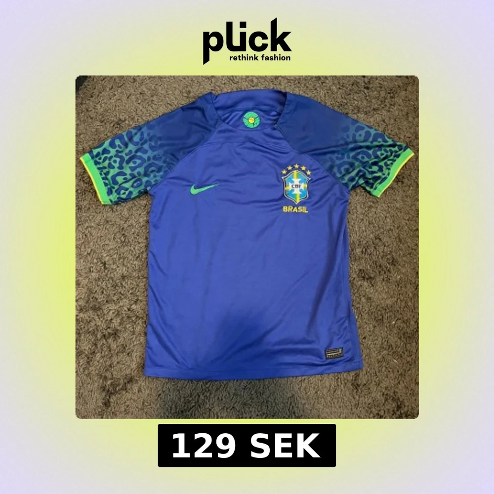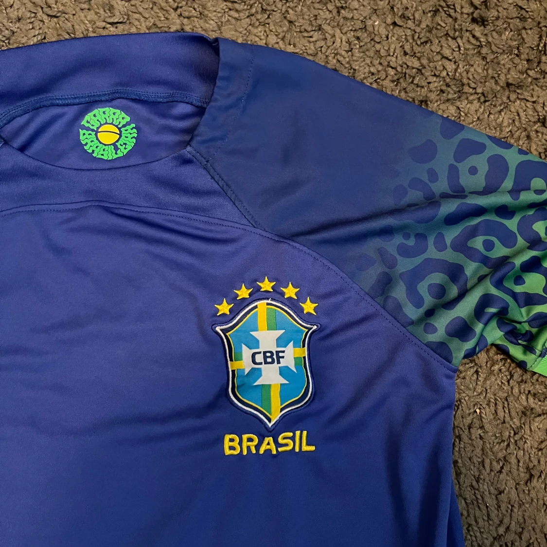 Säljer en blå Brasilien fotbollströja från Nike med coolt leopardmönster i grönt på ärmarna och gula detaljer vid mudden. Tröjan har Brasil-logga med fem stjärnor på bröstet och är tillverkad i lätt, ventilerande polyester. Perfekt för dig som älskar fotboll och snygg design.