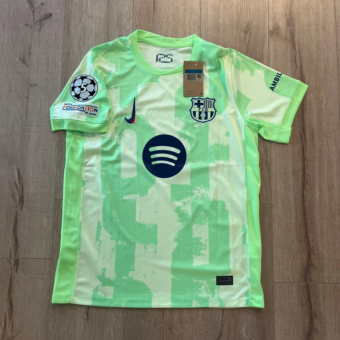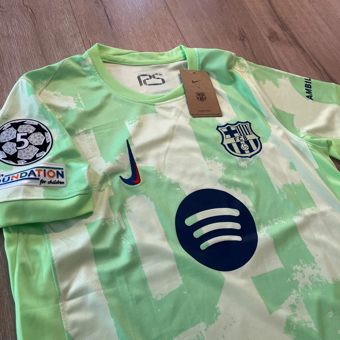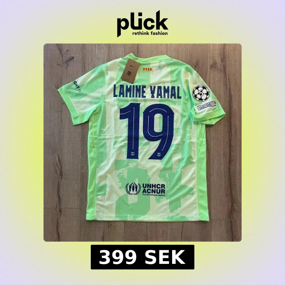 Säljer en Barcelona fotbollströja med Lamine Yamal och nummer 19 på ryggen. Tröjan är ljusgrön med ett abstrakt mönster, har korta ärmar och är tillverkad i lätt polyester. Officiella tryck från Champions League och UNHCR samt Spotify-logga på bröstet. Perfekt för dig som älskar Barca!