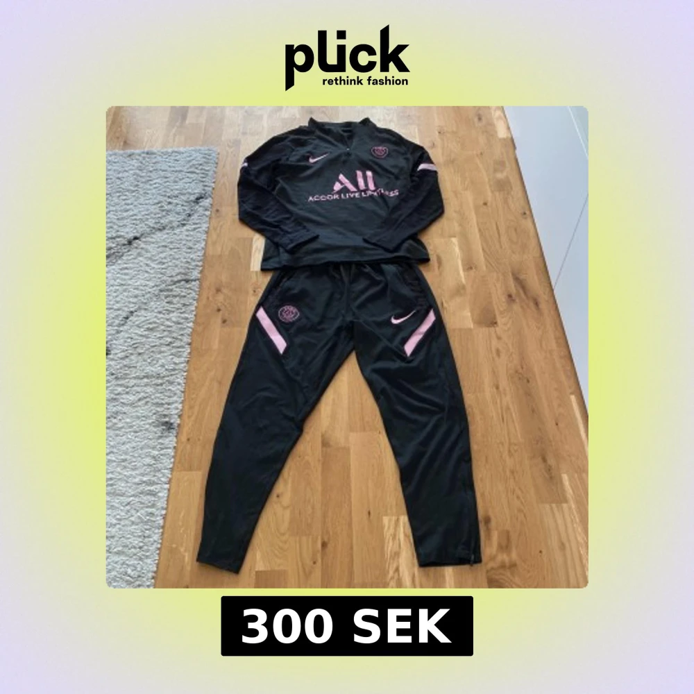 Säljer en svart långärmad PSG på byxorna är det ingen dragkedja. träningsoverall från Nike med rosa detaljer och loggor. Tröjan har halv dragkedja och byxorna har resår i midjan. Materialet är lätt och andas, perfekt för träning eller uppvärmning.