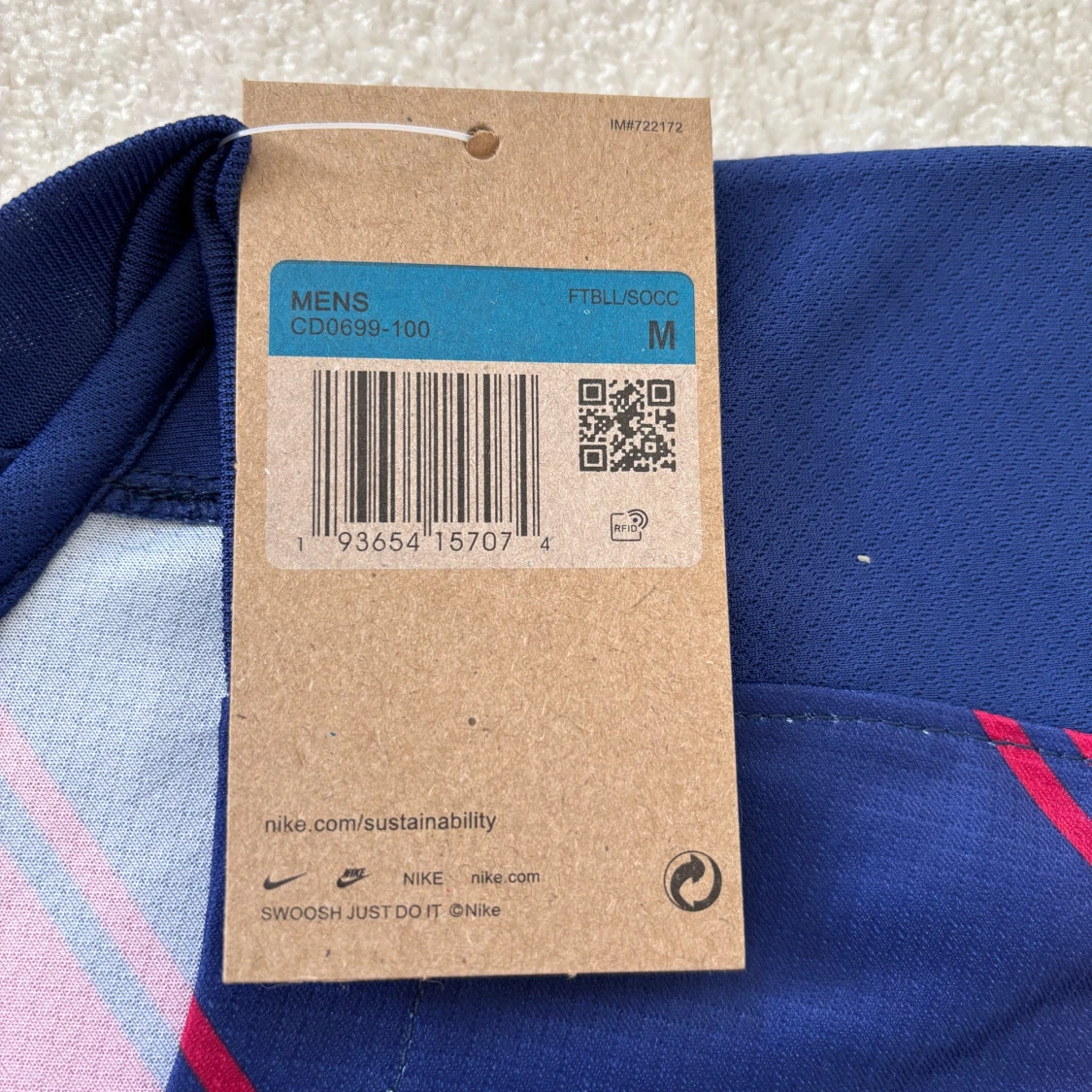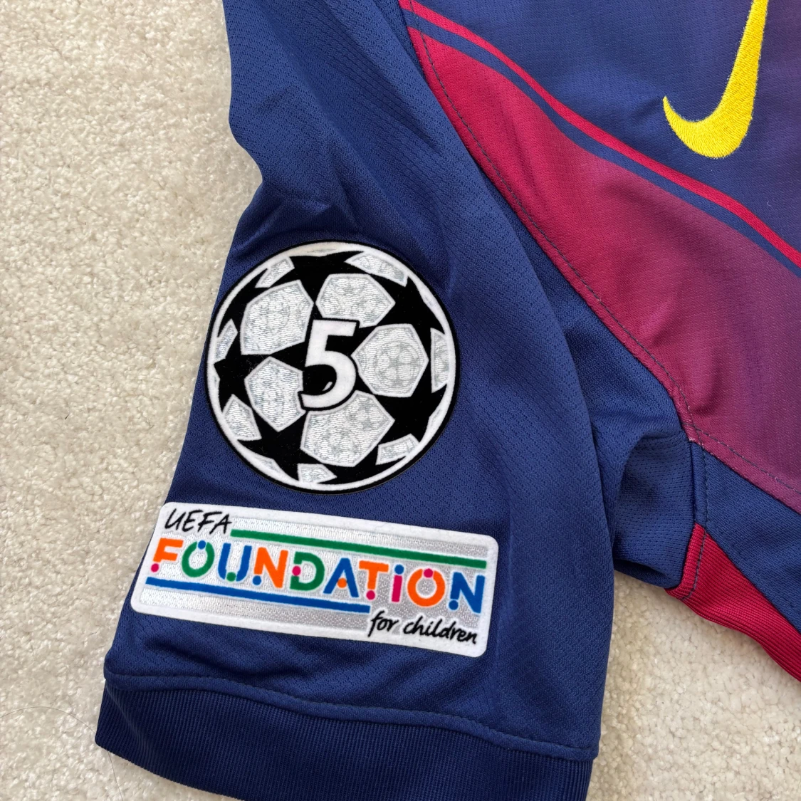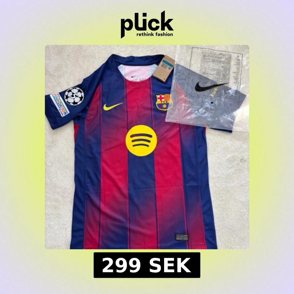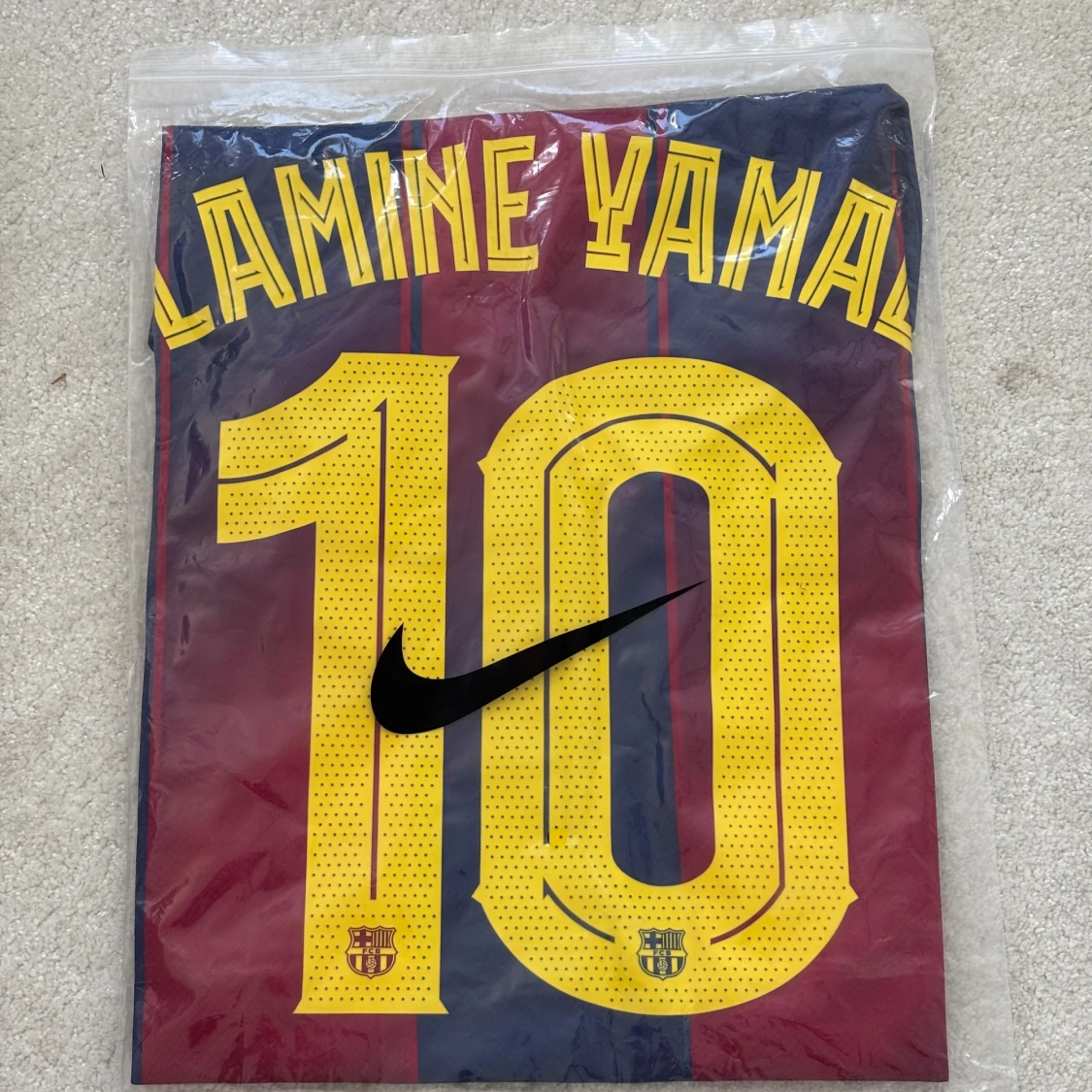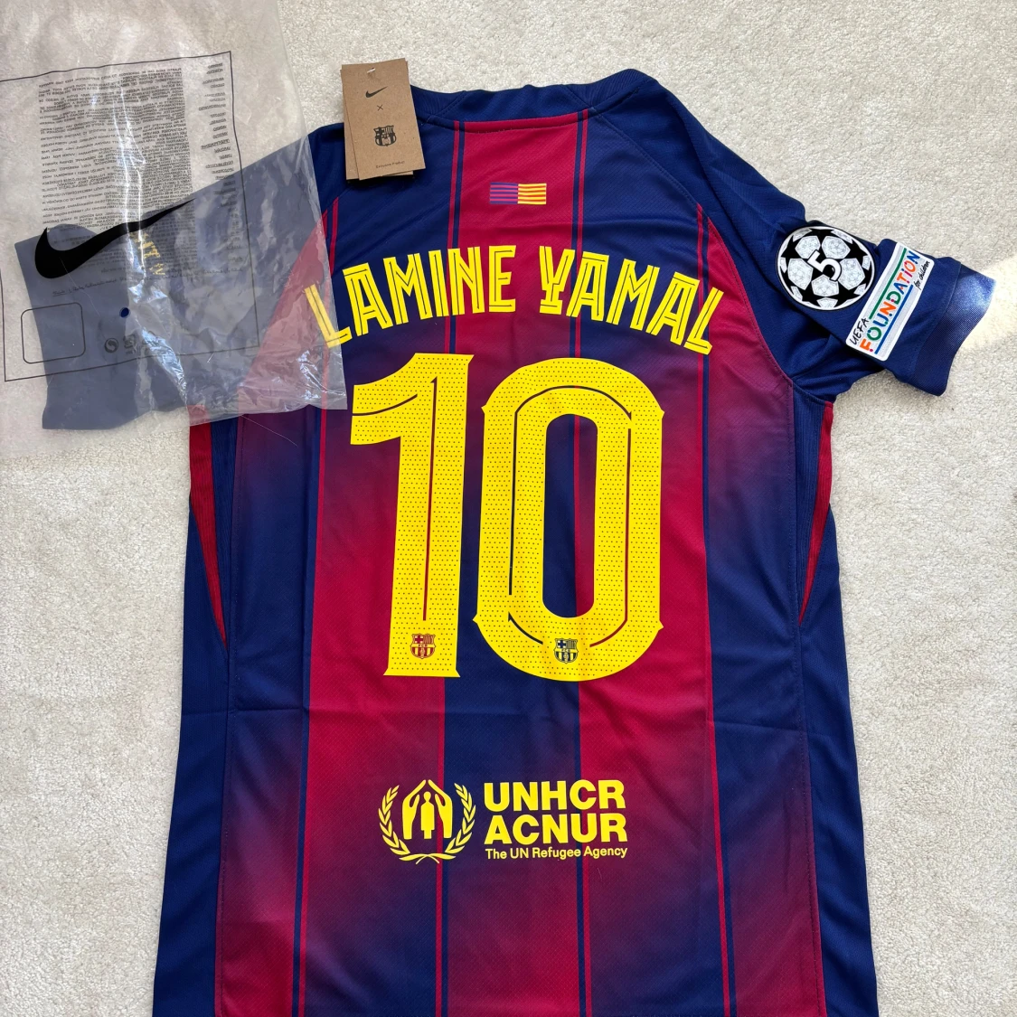 Snygg FC Barcelona matchtröja med Lamine Yamal och nummer 10 på ryggen. Tröjan är kortärmad, har klassiska blå och röda ränder, gula detaljer och klubbmärke på bröstet. Tillverkad i lätt polyester med Champions League och Foundation-patch på ärmen.