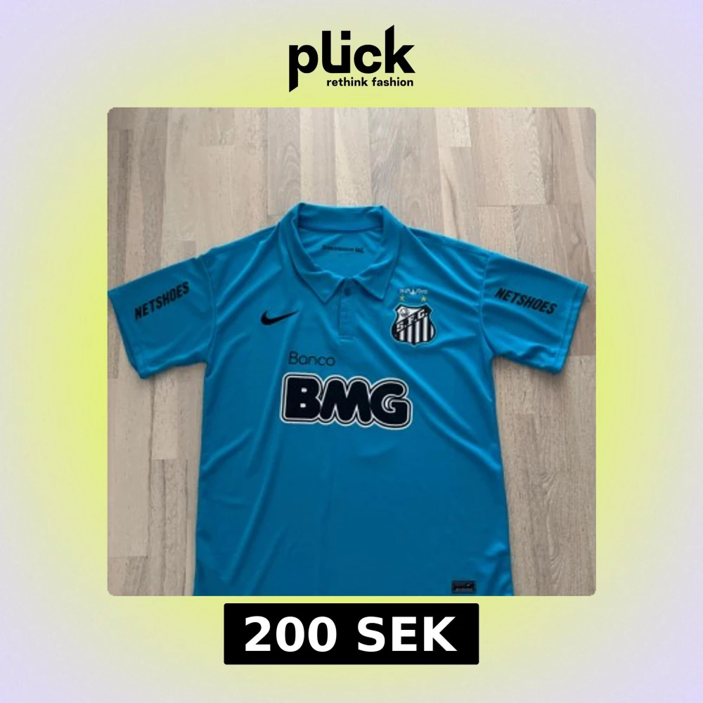 Blå fotbollströja från Nike med Santos FC-emblem, Neymar Jr och nummer 11 på ryggen. Tröjan har korta ärmar, krage med knappar och tryckta sponsorer som BMG och Netshoes. Perfekt för dig som älskar brasiliansk fotboll och Neymar.