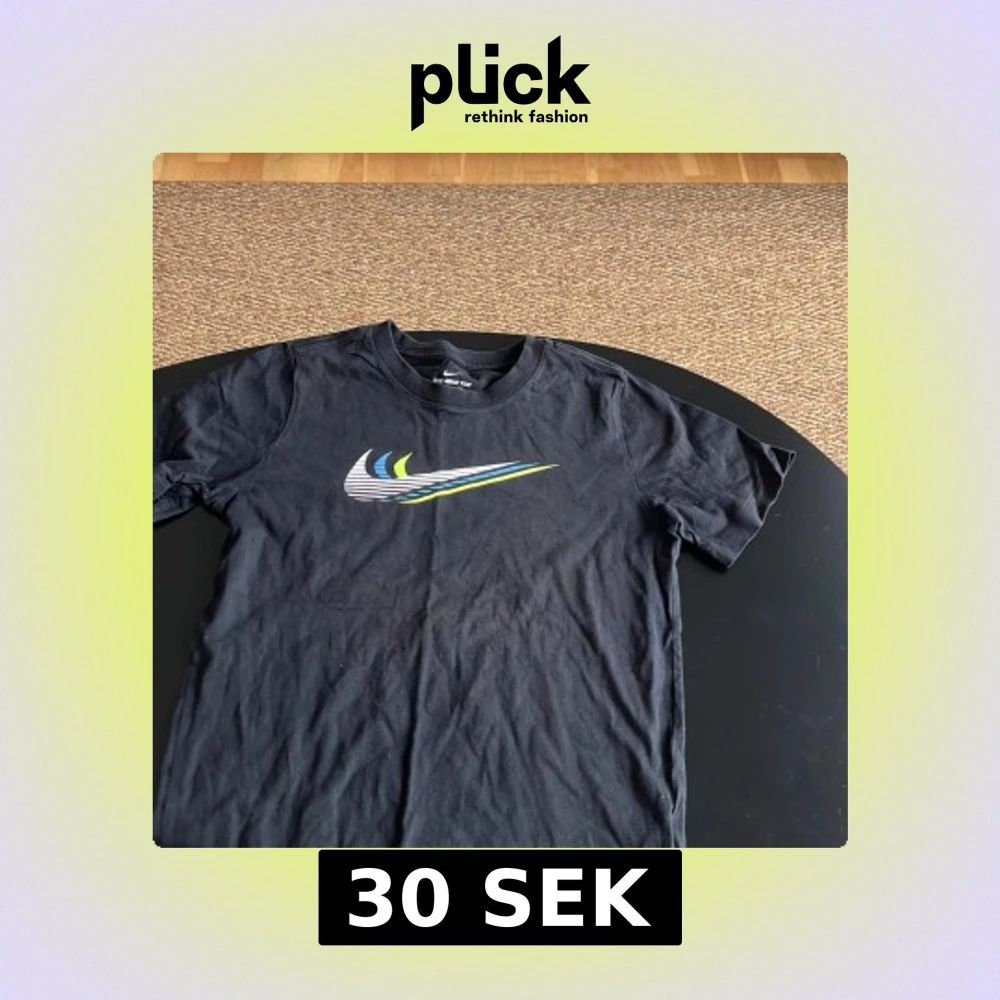 Säljer en svart t-shirt från Nike med ett stort, stilrent logotryck i vitt, blått och grönt på framsidan. Perfekt för en sportig look eller avslappnad stil. T-shirten har korta ärmar och rund halsringning.
