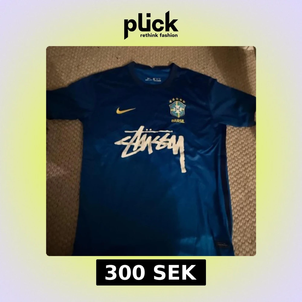 Snygg blå Brasilien fotbollströja från Nike med Stüssy-logga i vitt på bröstet. Tröjan har korta ärmar, gul Nike-swoosh och Brasilien-emblem med stjärnor. Tillverkad i lätt och ventilerande material, perfekt för match eller streetstyle.